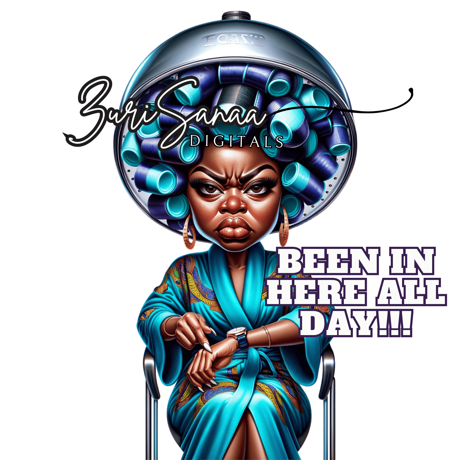 Unveil the essence of African American motherhood with our exclusive "Black Mommas in the Beauty Shop" collection. This top-selling bundle features 10 glossy, caricature illustrations of an African American woman adorned with pronounced features, looking straight ahead. Each image captures her unique beauty and strength, her hair set in large colored rollers, wrapped in an Ankara print cotton robe, symbolizing the warmth and vibrancy of African American culture. Please NOTE ONLY 9 are shown. Due to the 9 image limit upload. There will be 10 images in your files. Each quote has been carefully selected to represent the wisdom, humor, and enduring spirit of African American mommas in the Beauty Shop echoing the voices of the community back in the day.
