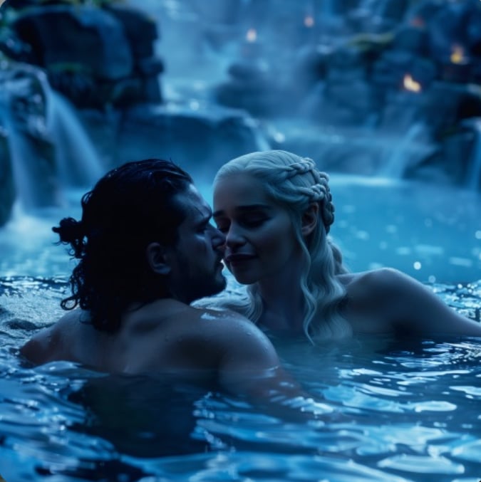 Serene moment of Jon and Daenerys swimming at the hot springs in winterfell. 8 second animation, on TikTok if you’d like a preview! This animation comes with my Watermark. Beautiful moonlight, blue tones, water movement. Based at winterfell.
