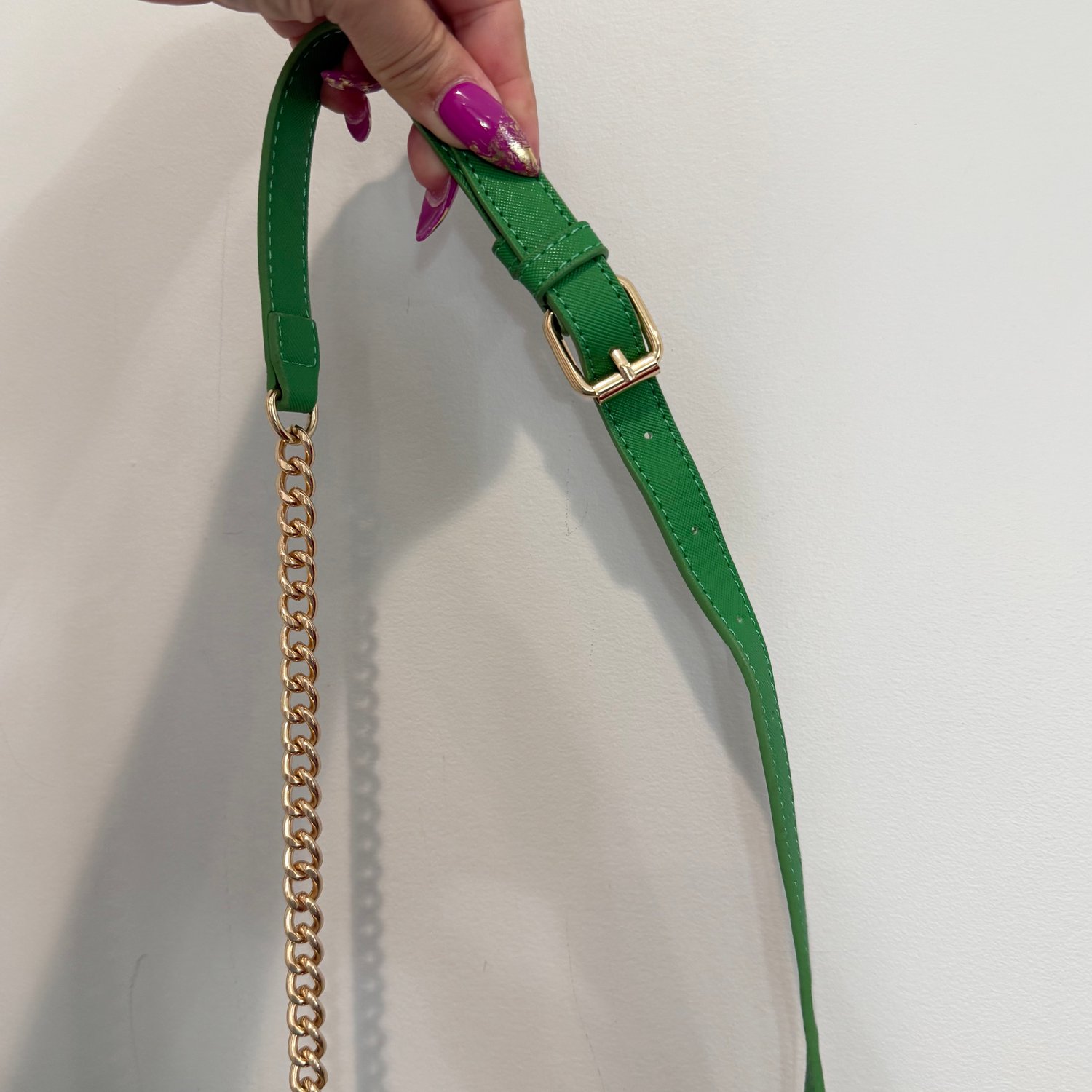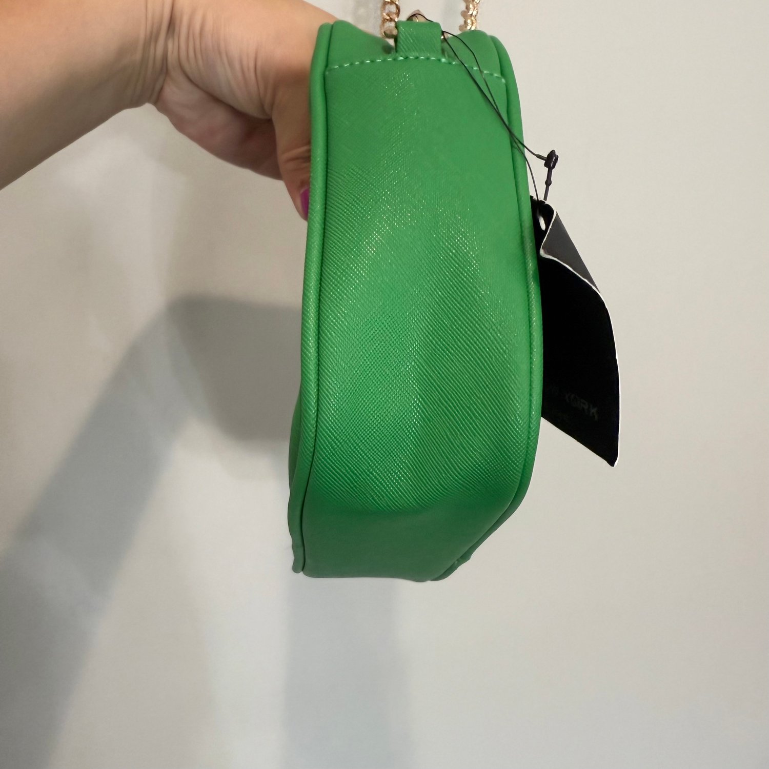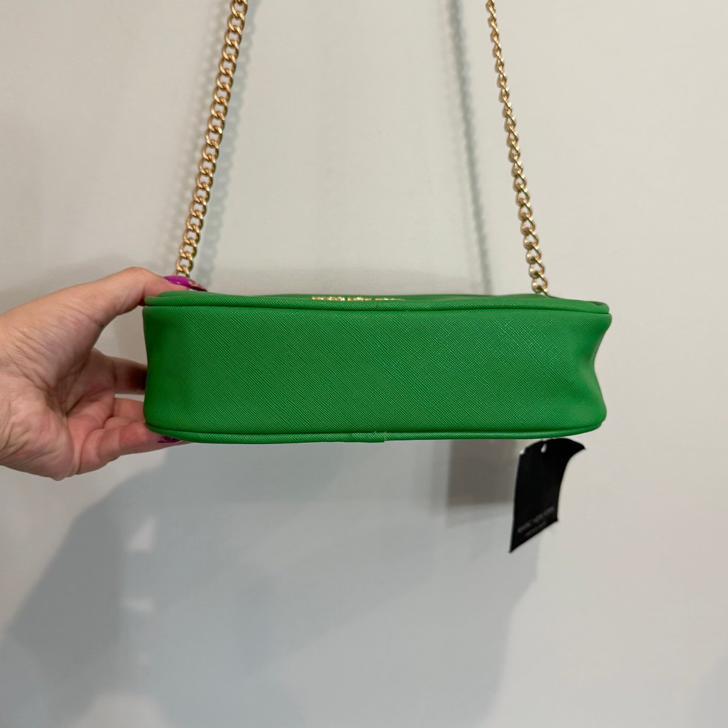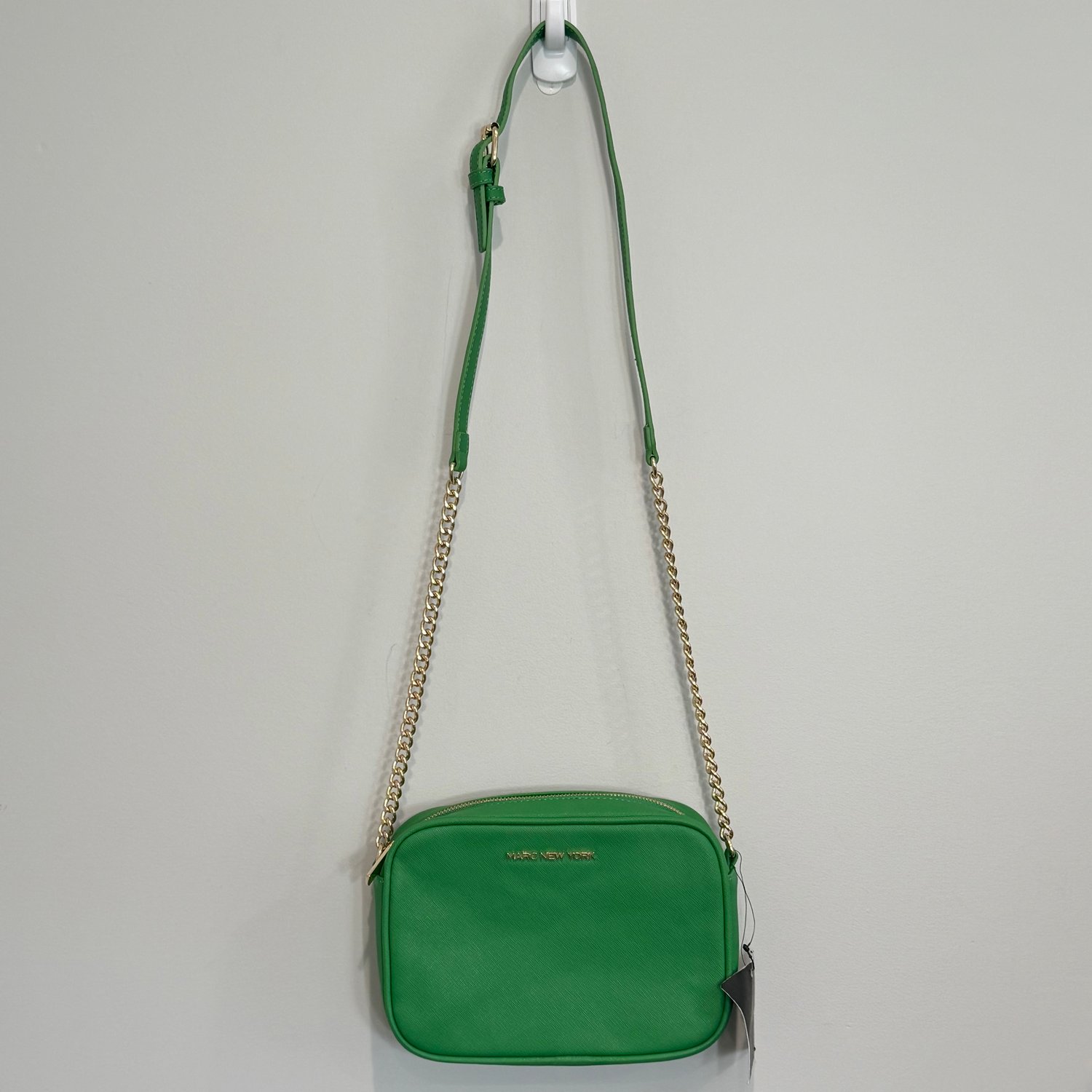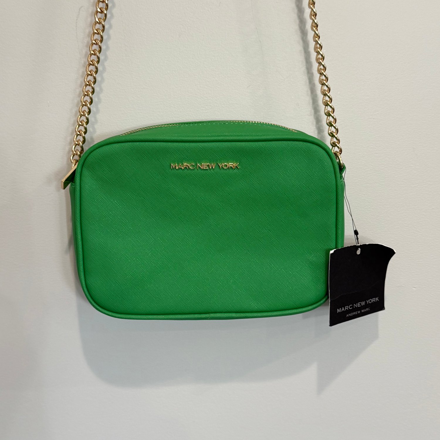 Marc New York by Andrew Marc kelly green faux Saffiano leather crossbody with gold tone hardware and chain detail on the strap.