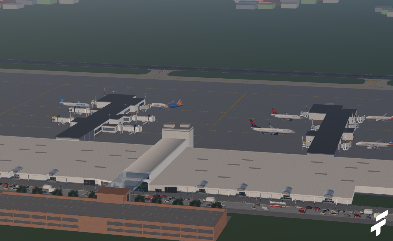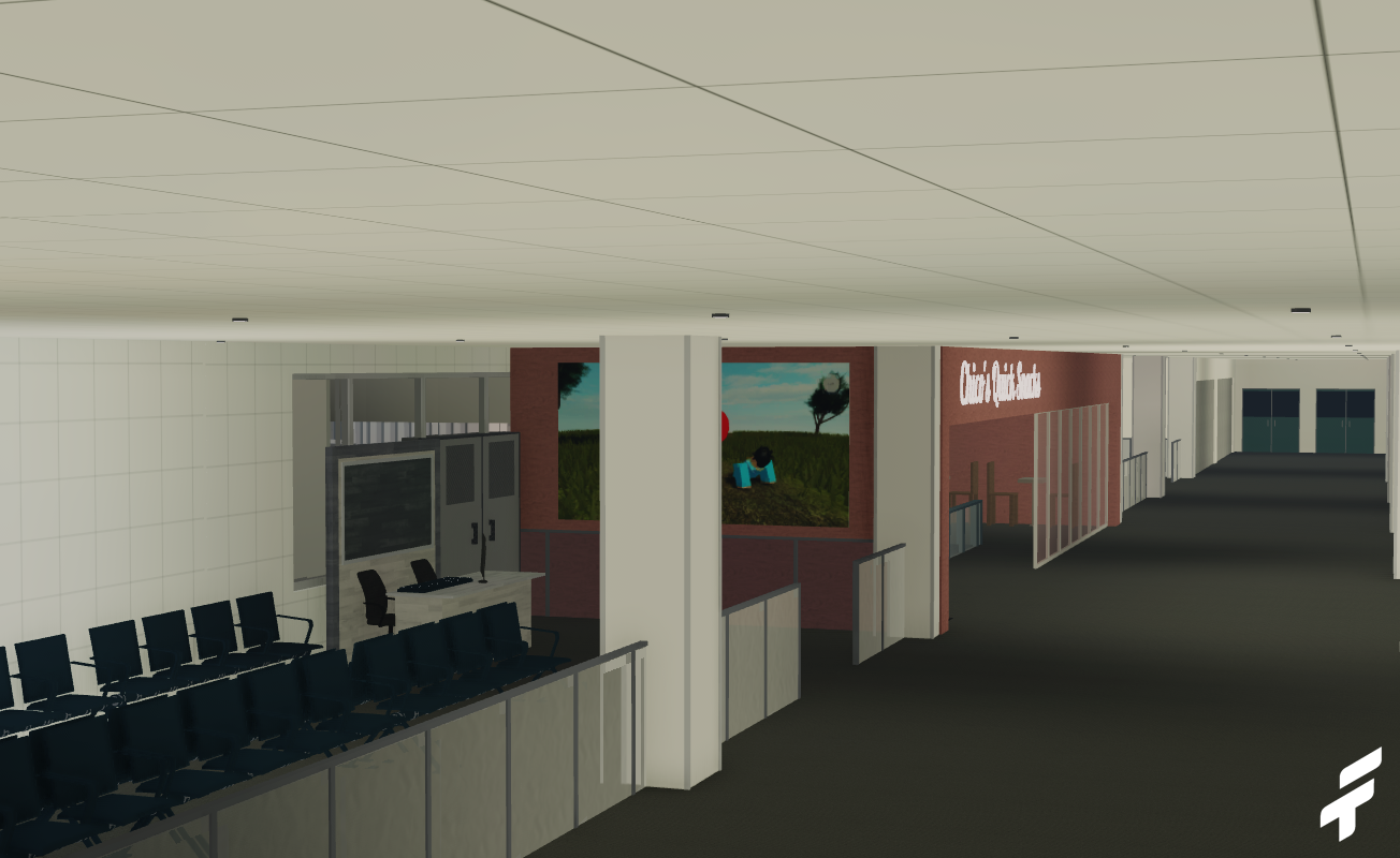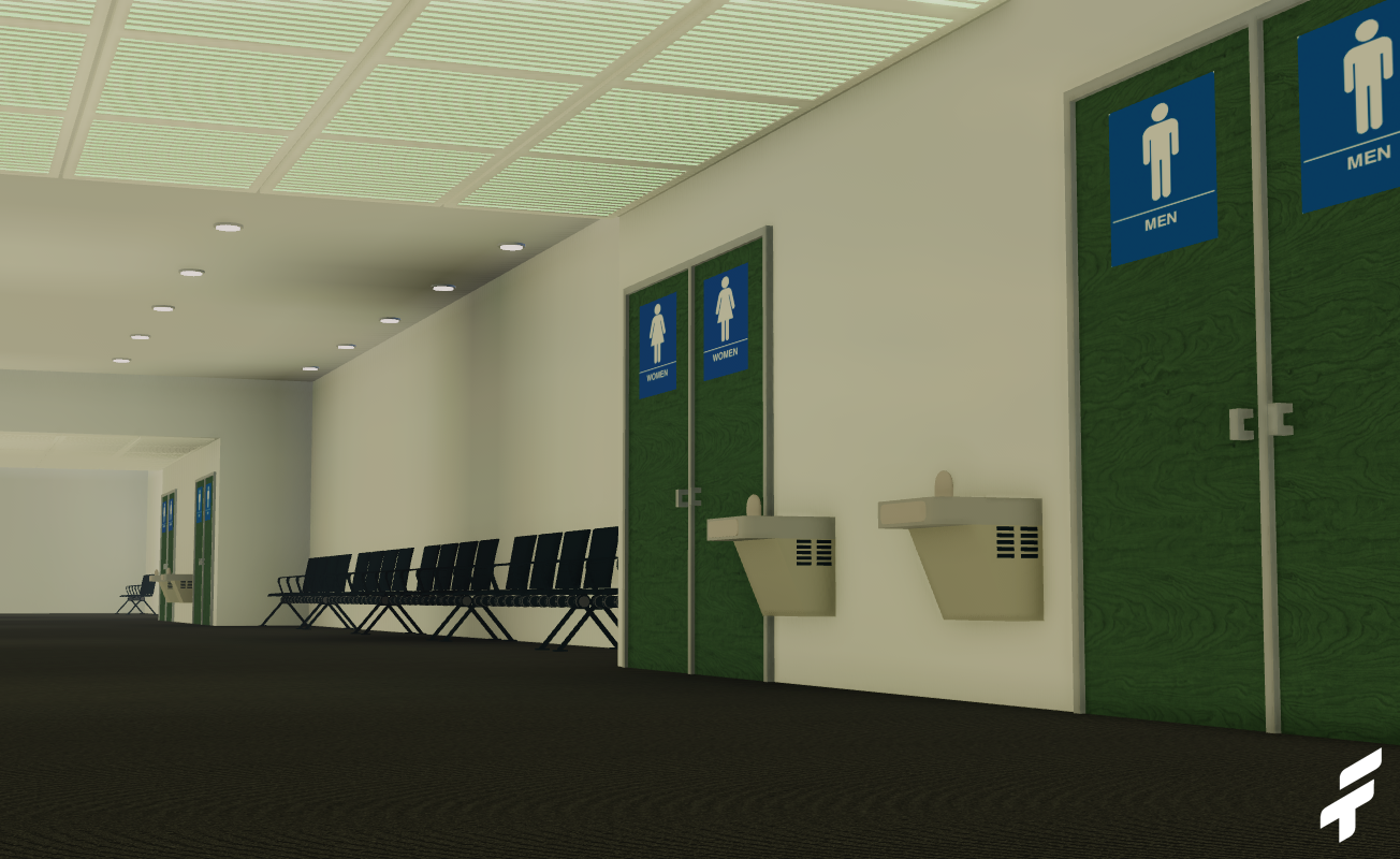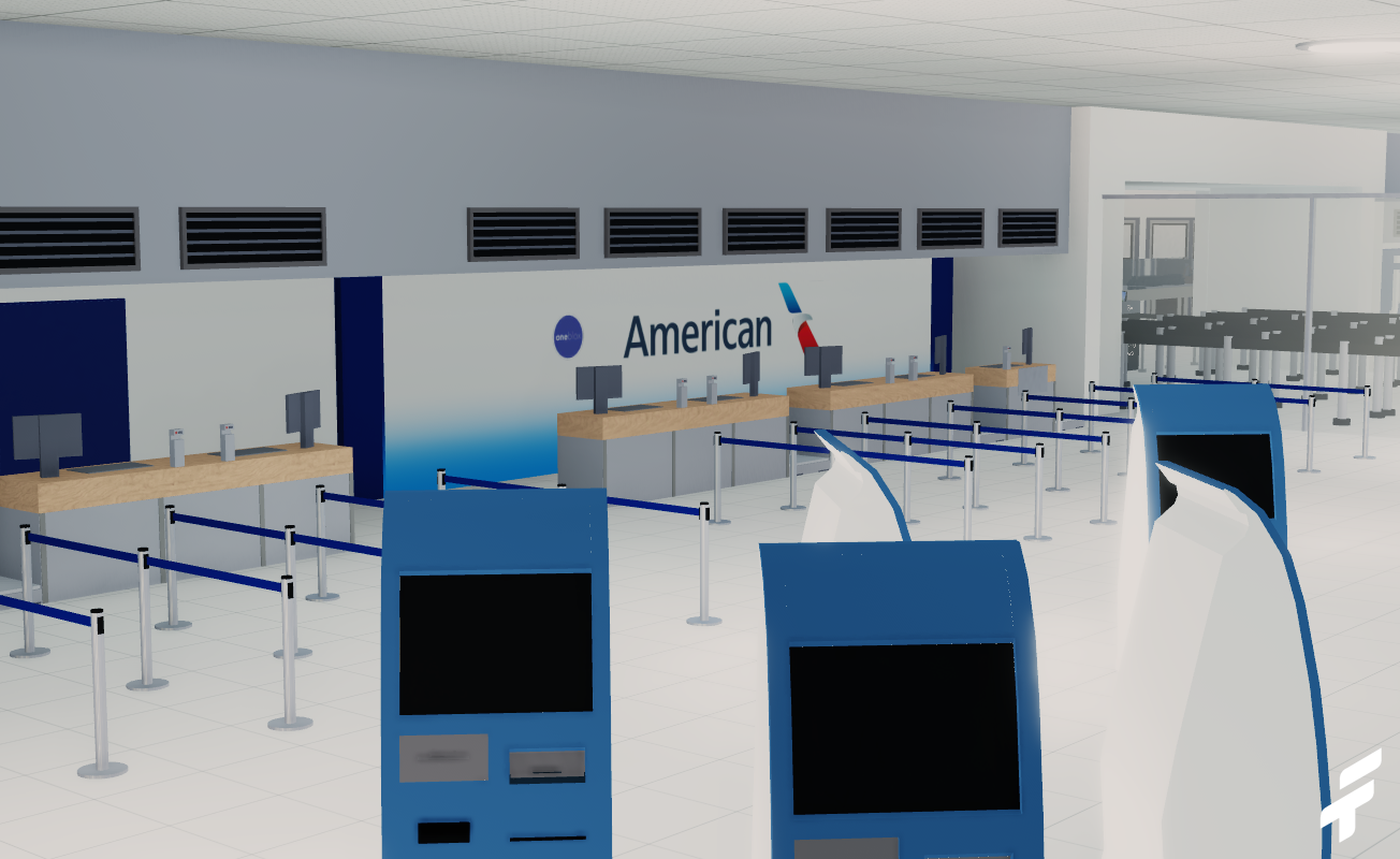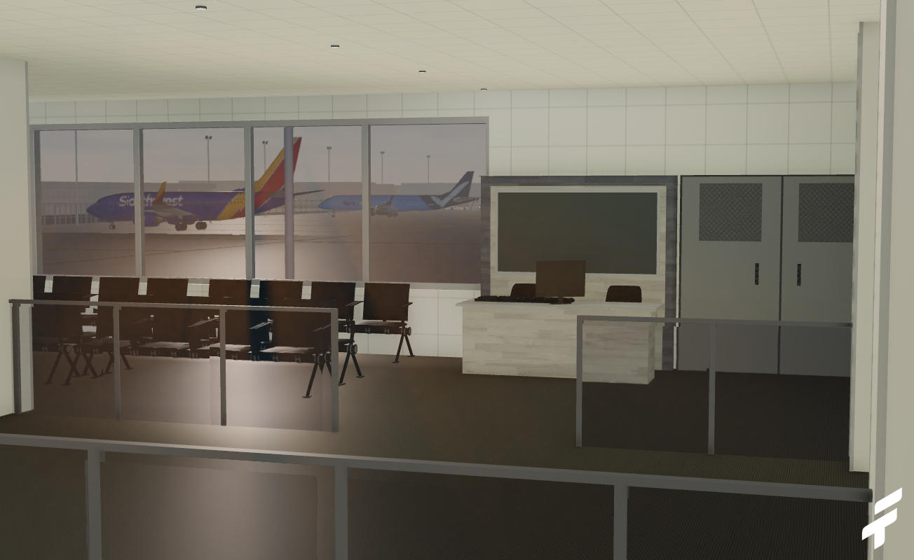 -Quality interior, including check-in area, gate area, lounge, and airport stores and restaurants.