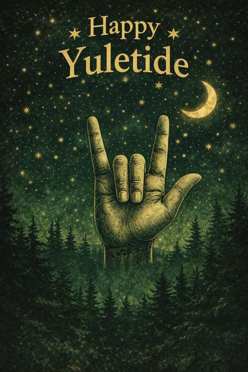 Celebrate the quiet beauty of the season with this Happy Yuletide ASL poster, featuring the American Sign Language ILY (I Love You) handshape set beneath a star-filled night sky and crescent moon, rising above a peaceful evergreen forest.