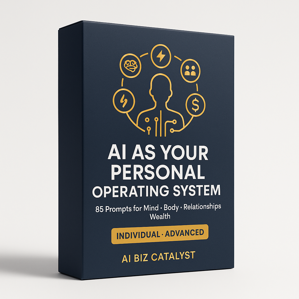 Make AI the ultimate co-pilot for every area of your life. "AI as Your Personal Operating System(TM)" gives you 85 advanced prompts across four pillars -- Mind, Body, Relationships, and Wealth -- for total life transformation.