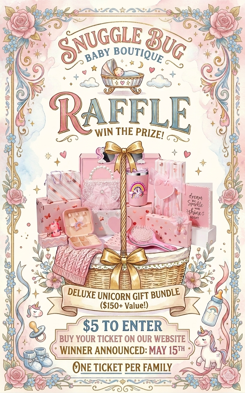 Step into a world of whimsy with the Snuggle Bug Baby Boutique Raffle! We are giving away the ultimate Deluxe Unicorn Gift Bundle, valued at over $150. This fancy, hand-picked collection is packed with everything a little dreamer needs—from shimmering accessories and plush surprises to boutique treasures.