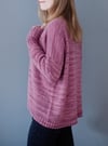 The upper back is worked first. Stitches for each front are then picked up from the CO-row of the back and worked separately to the given length, adding the V-neck shaping. The fronts are then joined and worked in one piece to the same length as the back. Front and back are then joined and the body is worked in the round, shaping the hem with short rows. Stitches for the sleeves are picked up around the armholes and the sleeves are worked in the rounds towards the cuffs.