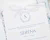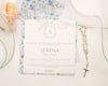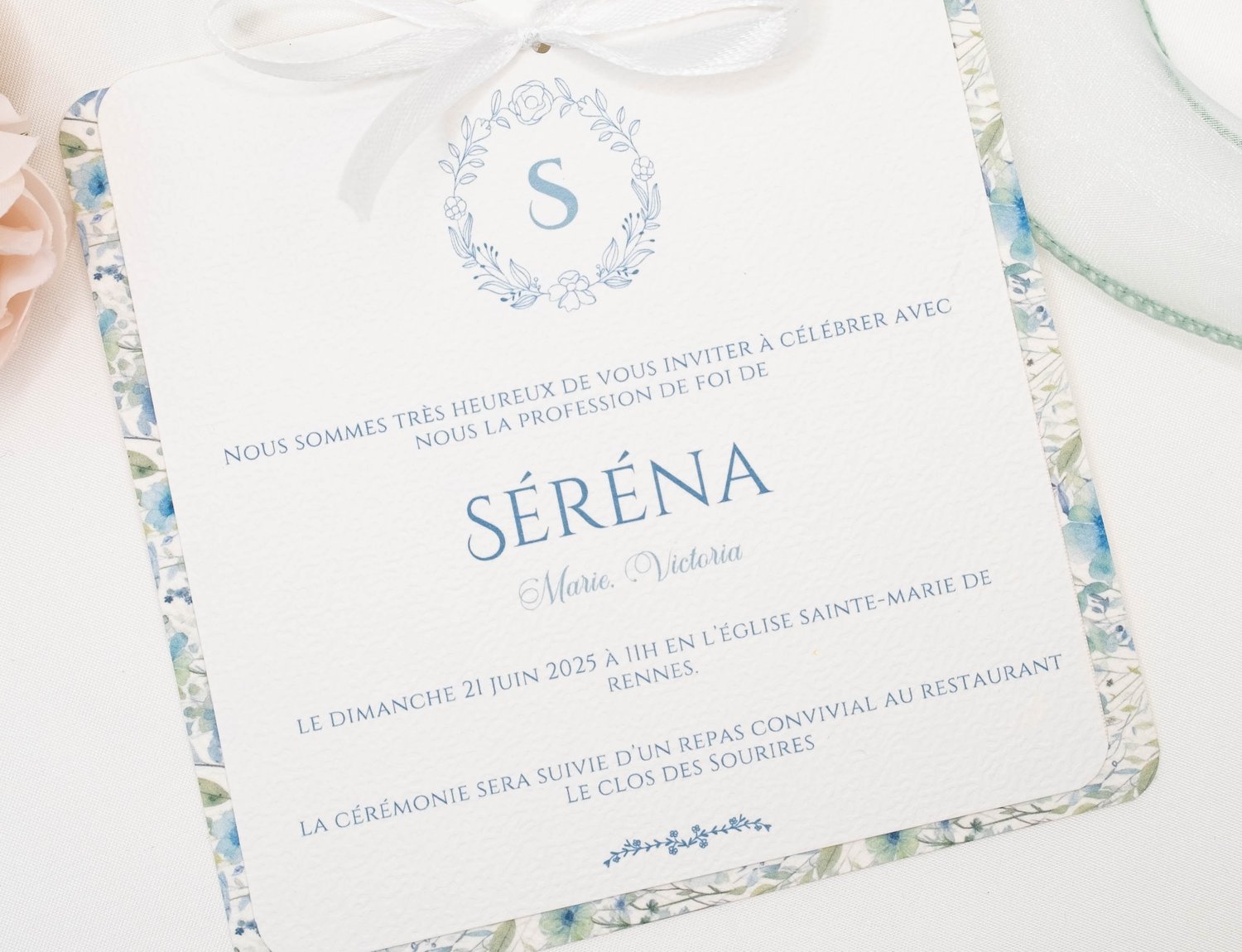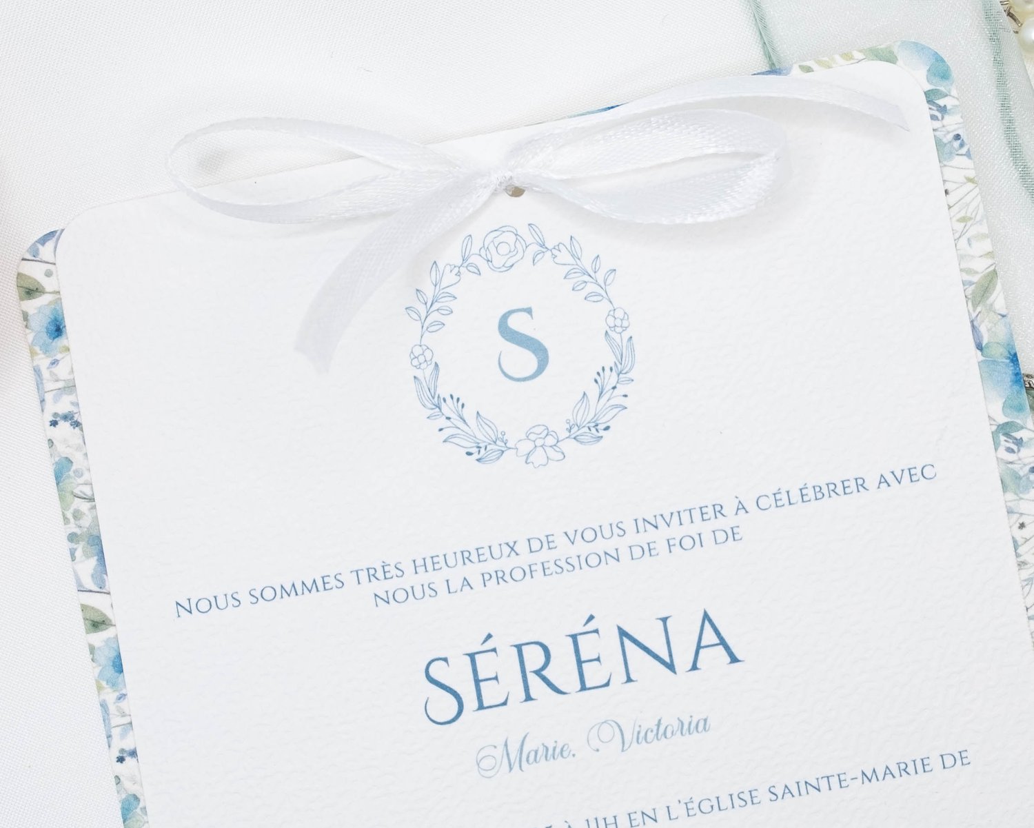 Son fond fleuri, aux nuances bleu et vert d’eau, évoque la fraîcheur et l’innocence. Sur le volet supérieur, l’initiale de l’enfant est entourée d’une couronne végétale délicate. En dessous, le prénom (et s’il y a lieu, les seconds et troisièmes prénoms) sont soigneusement inscrits, accompagnés d’une petite croix, ainsi que la date et le lieu de l’événement, et le texte de votre choix.