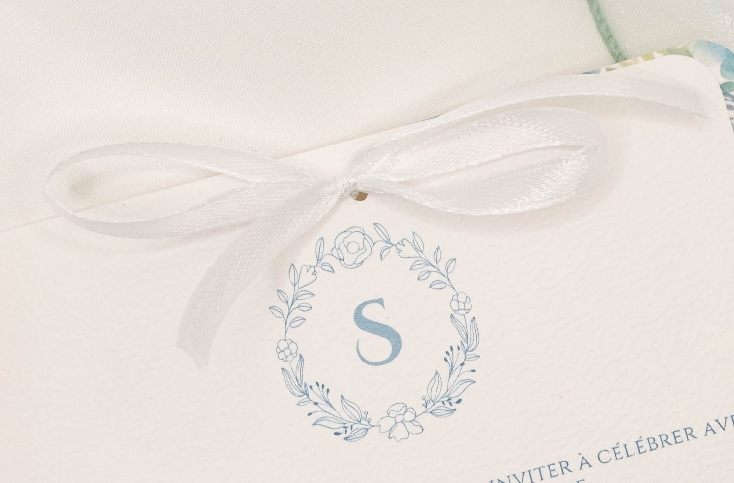 Ce faire-part est au format carré, de 13cm x 13cm. Les deux volets sont reliés par un noeud de satin, dont le coloris peut être modifié (le préciser dans le formulaire de personnalisation)