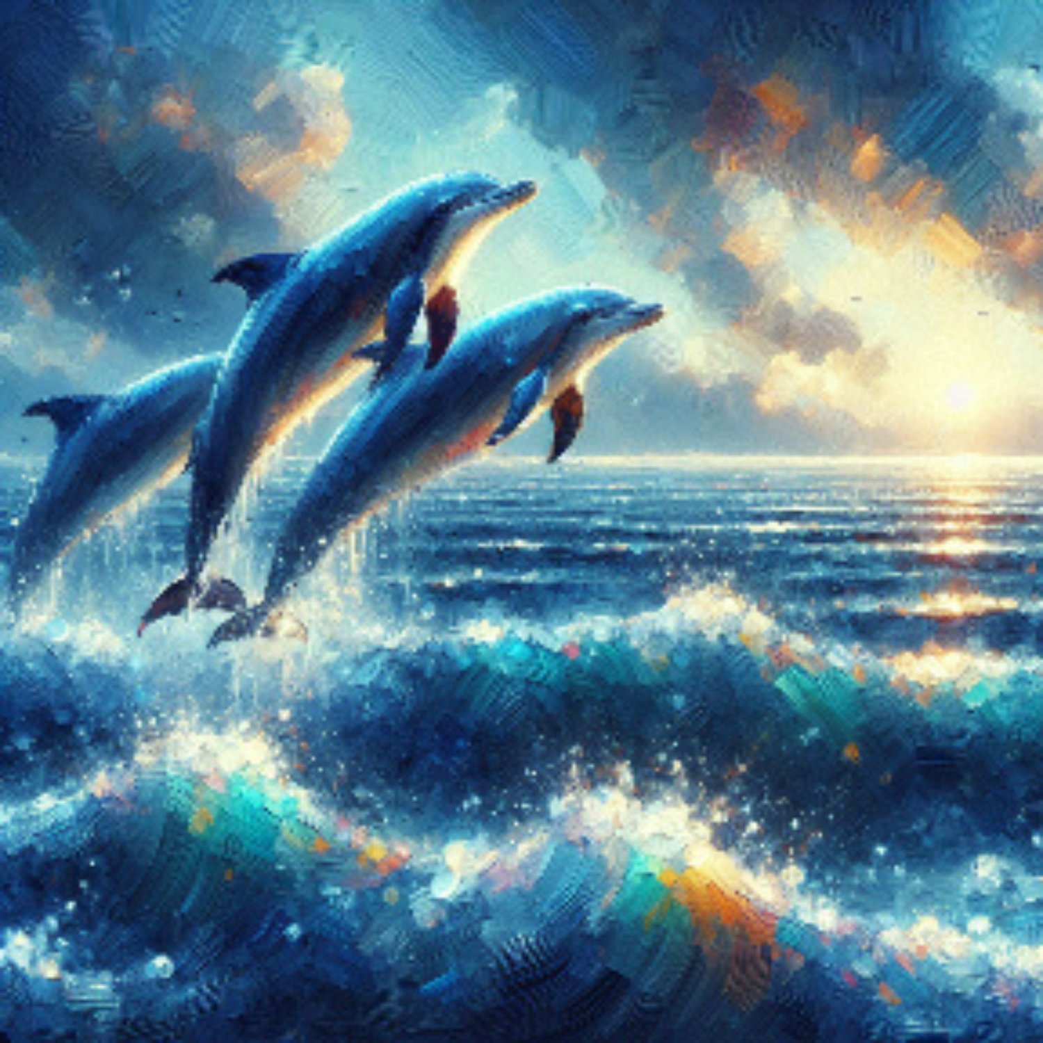 Feel the rhythm of the sea with Wave Riders — a dynamic, painterly digital artwork featuring three dolphins leaping joyfully through glowing ocean waves at sunrise. The rich brushstroke textures and vibrant blues bring this piece to life, making it a perfect choice for coastal, marine, or nature-inspired interiors.