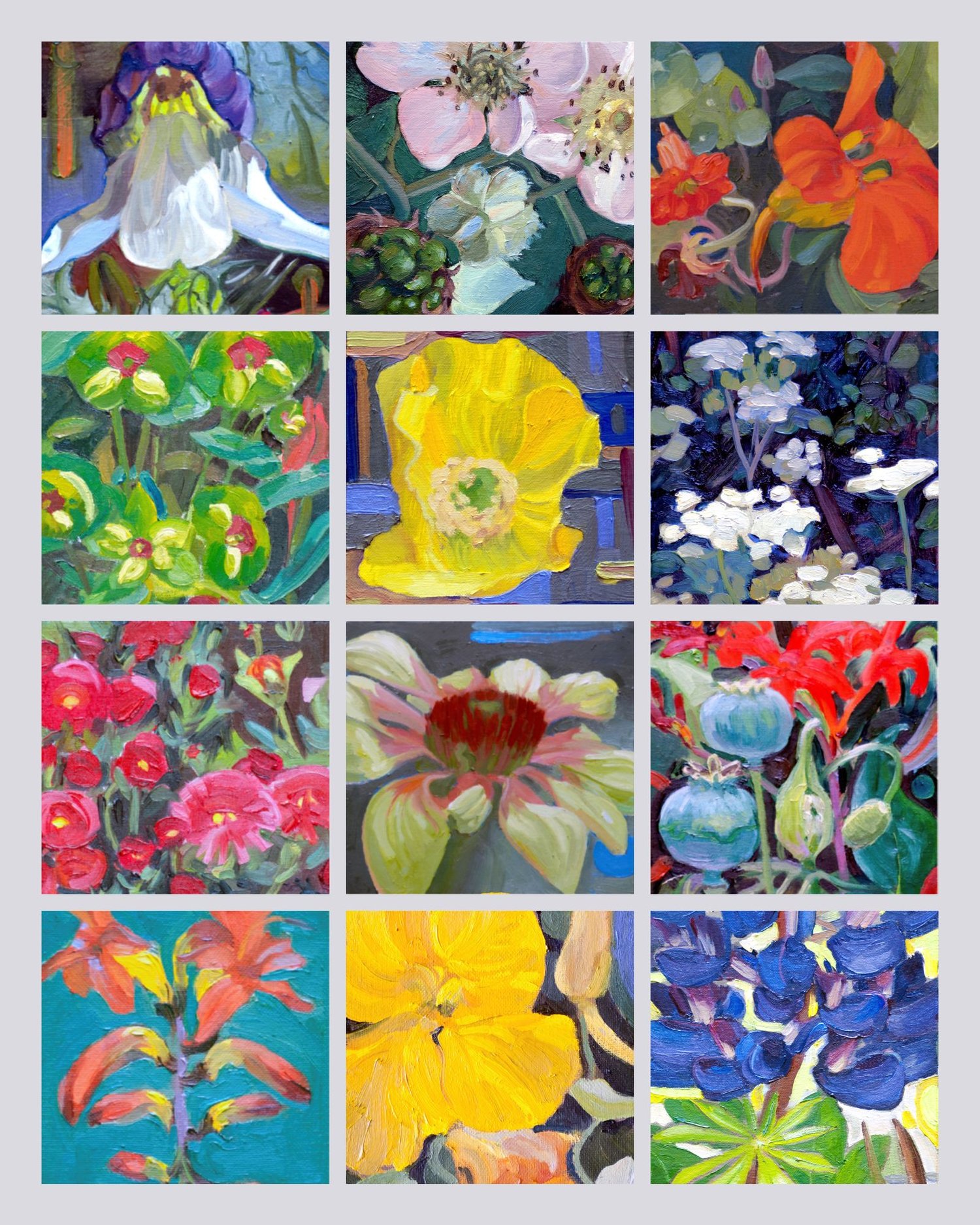A composite print created from twelve original floral oil paintings made in James’s studio and garden. Each panel reflects a different study of colour, light and botanical form, brought together as a single tile-style artwork.