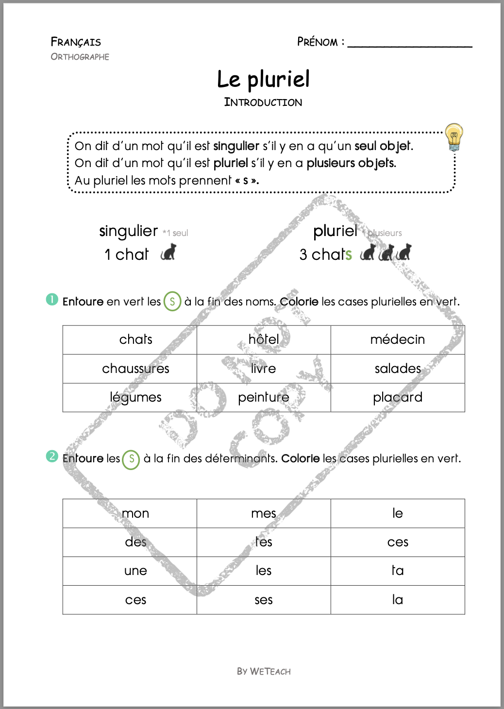 Dossier Progressif de 9 pages sur le Singulier et le Pluriel des noms et déterminants simples (pluriel terminaison s)