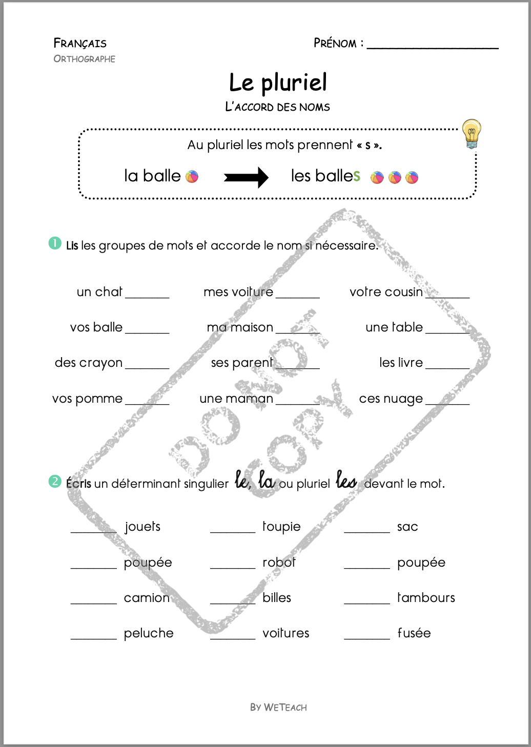 L'accord des noms : Des exercices pour reconnaître et comprendre la transition du singulier au pluriel. Application pour accorder les noms.