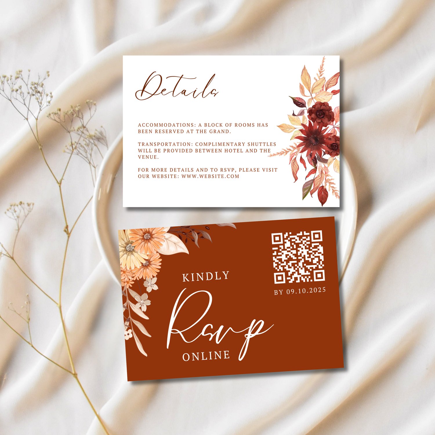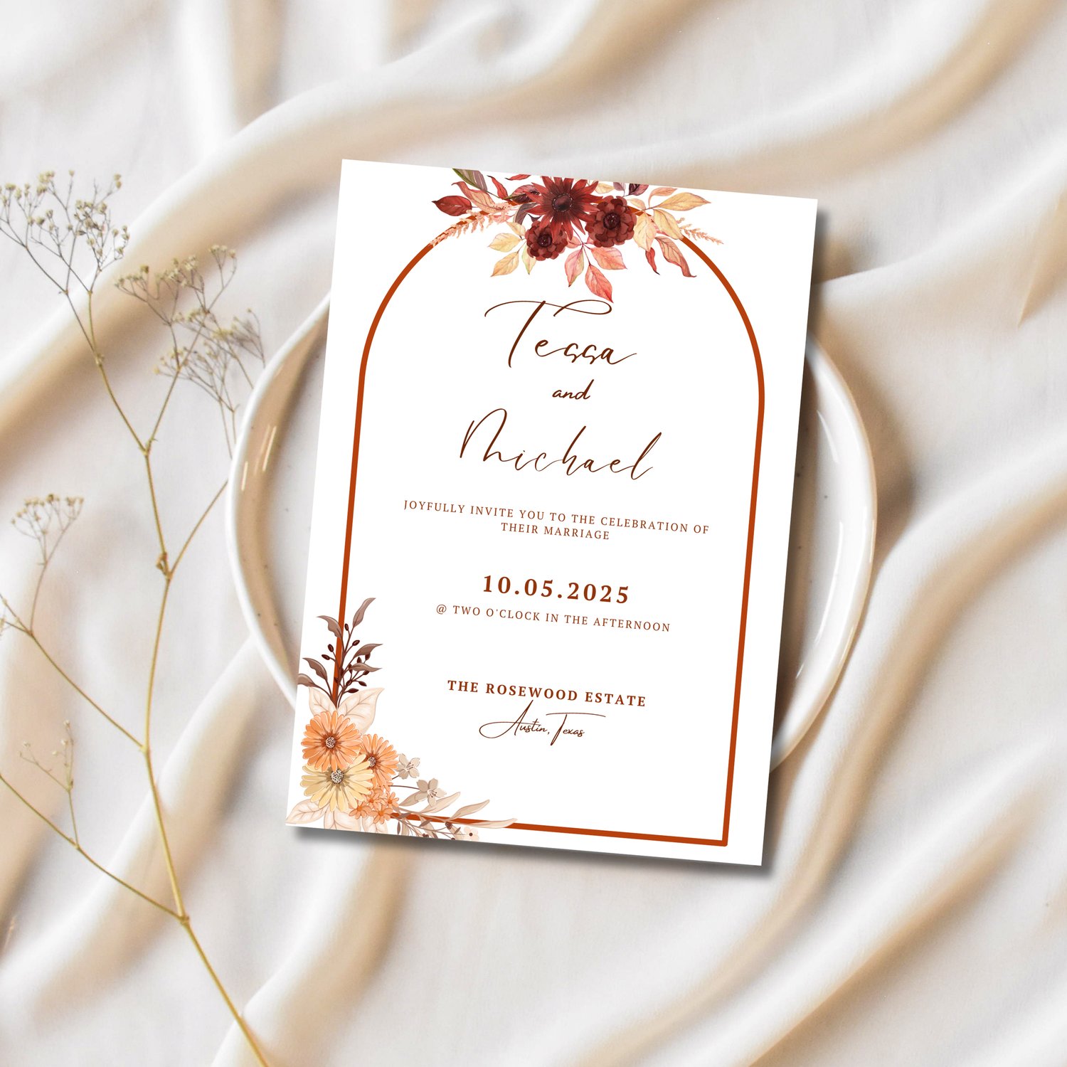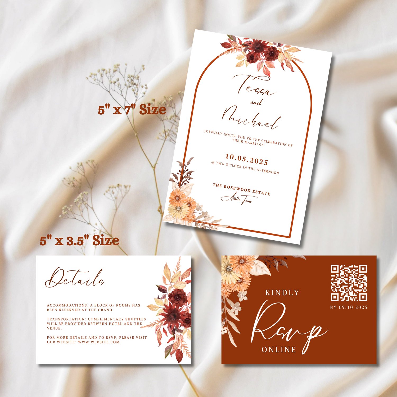 Autumn Wedding Invitation Rust Theme, Editable Canva Wedding Invitation Set Template