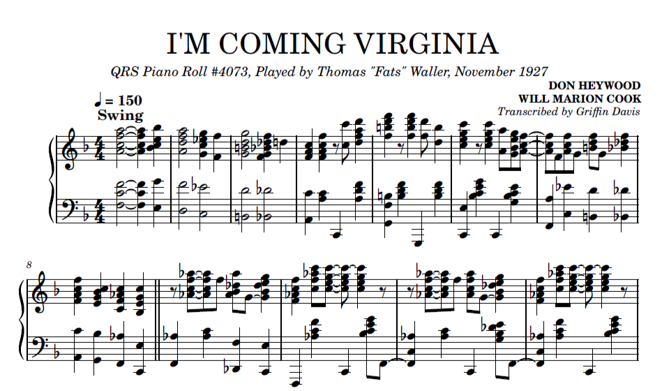 Transcription of "I'm Coming Virginia," played by Thomas "Fats" Waller in November of 1927, QRS Piano Roll 4073.