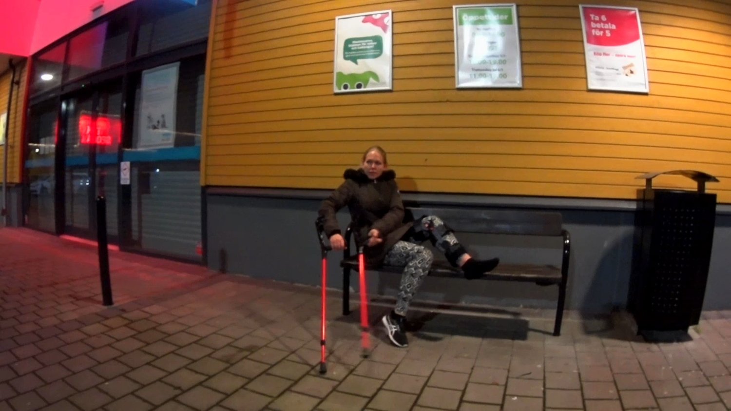 Rose has hurt her knee and must now use a kneebrace and crutches to get forward.She crutch to a bench there she sits down and remove her sock so can see that her bare foot not get to swollen.After she put the sock back on we follow Rose when she crutch around outside the shopping centerĀ