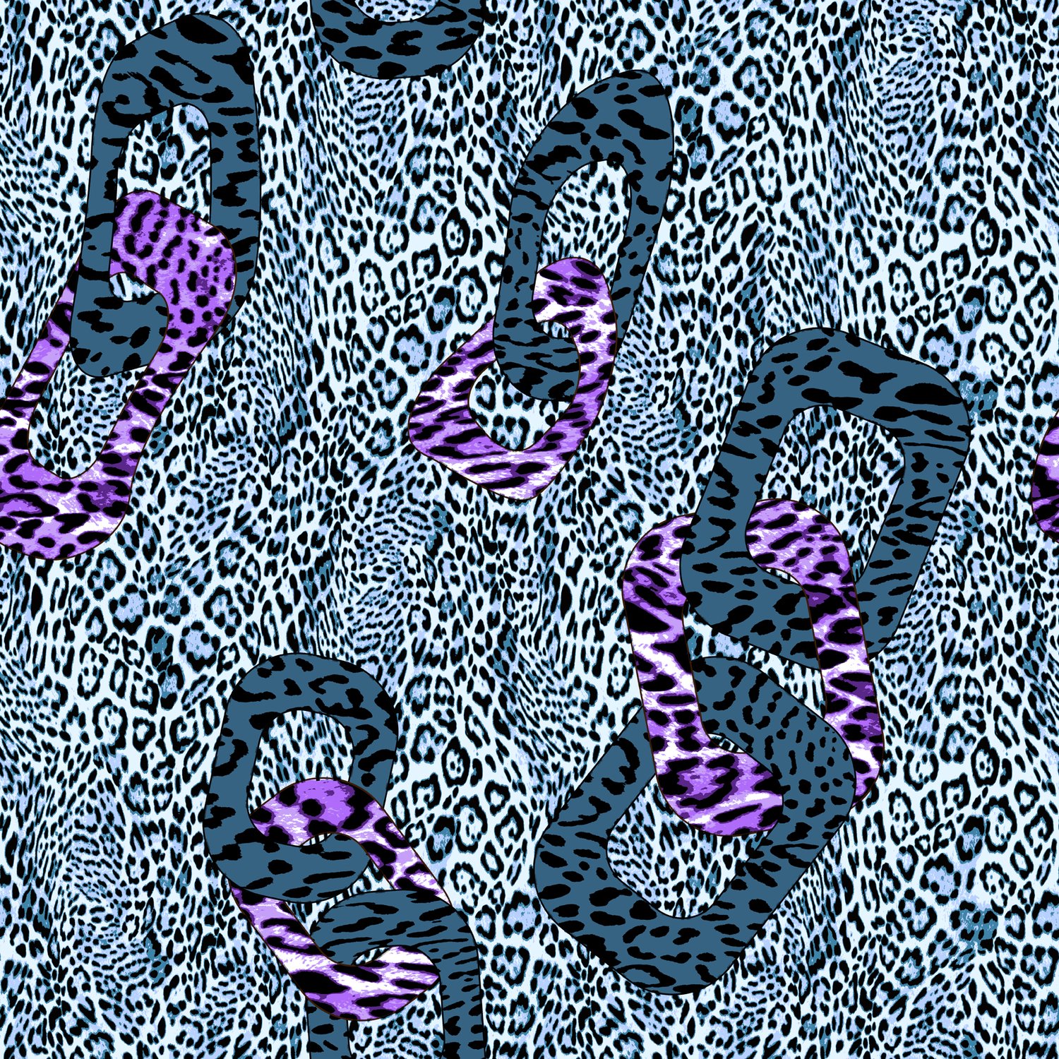 Edgy blue leopard texture accented with sleek geometric chain links.