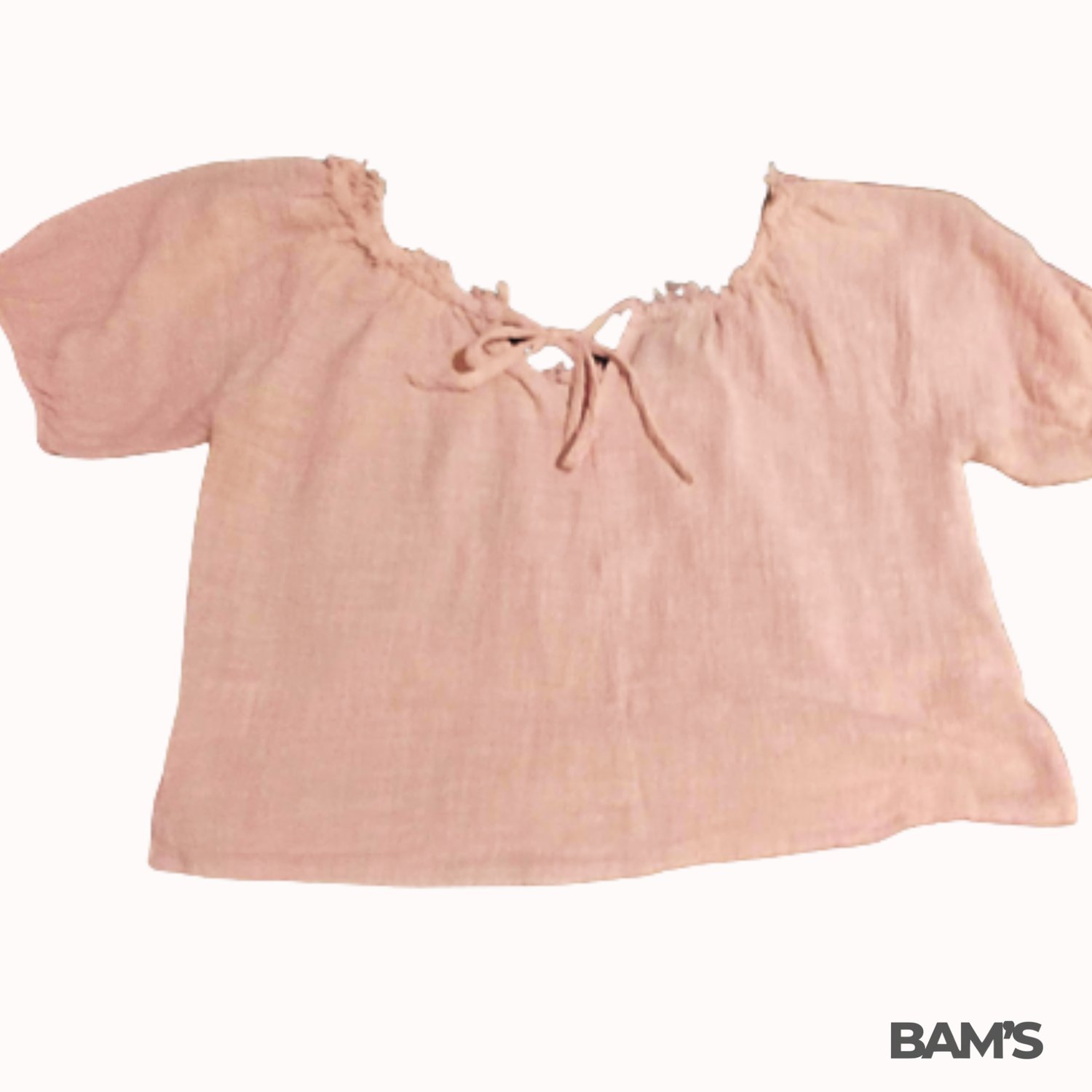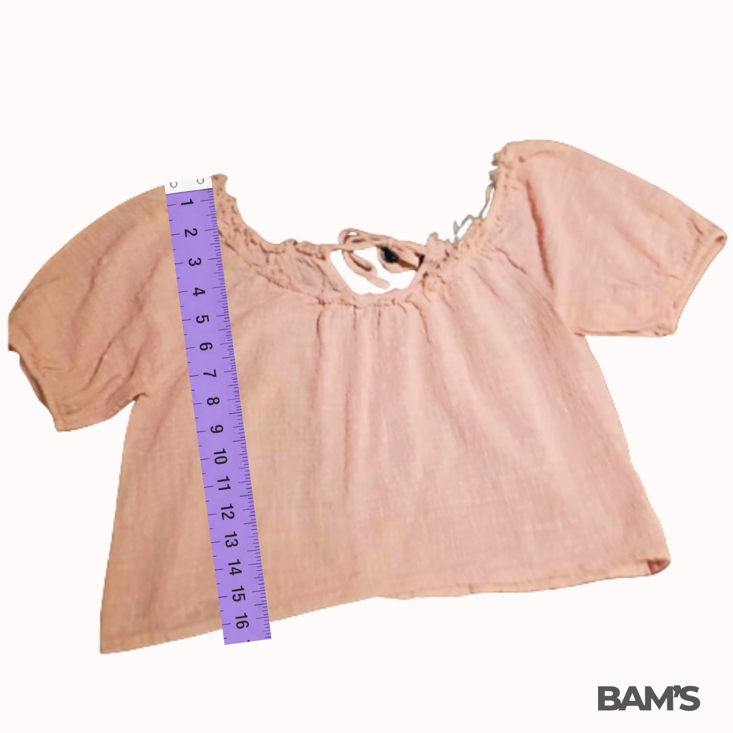 This cropped off‑shoulder top in a warm salmon hue features a gathered ruffled neckline with a delicate center bow and short puff sleeves. The lightweight, textured fabric drapes softly for a relaxed, flattering fit — ideal for pairing with high‑waist jeans, skirts, or shorts.