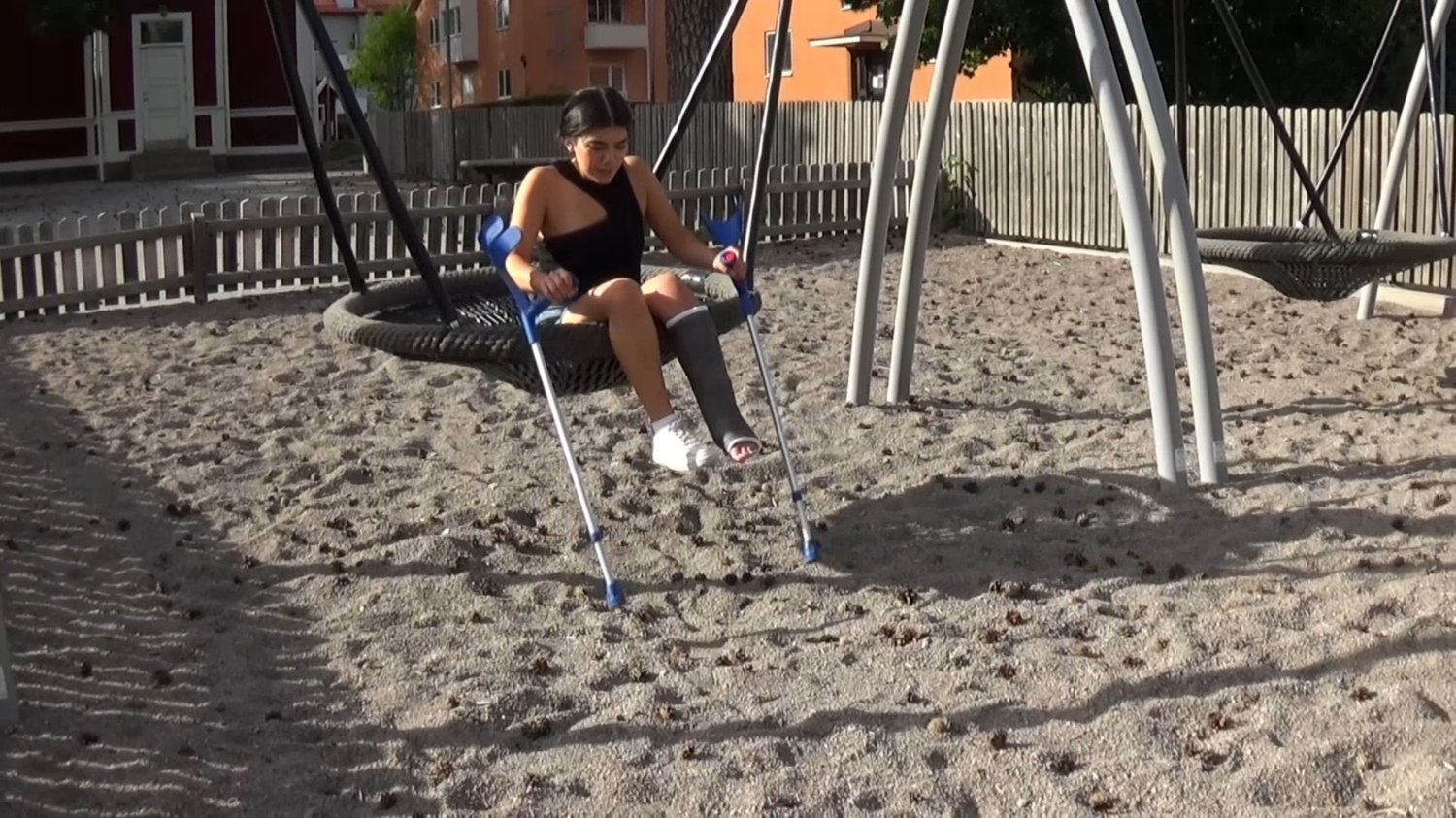 In a parking lot we meet Pascale who has a black SLC on her left leg. She jumps up some stairs nearby and further into a playground where she jumps in the sand to a larger swing and speeds up the swing by using the crutches.Once there, she films her own black SLC in close-up and her cute toes are painted with white nail polish.