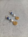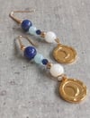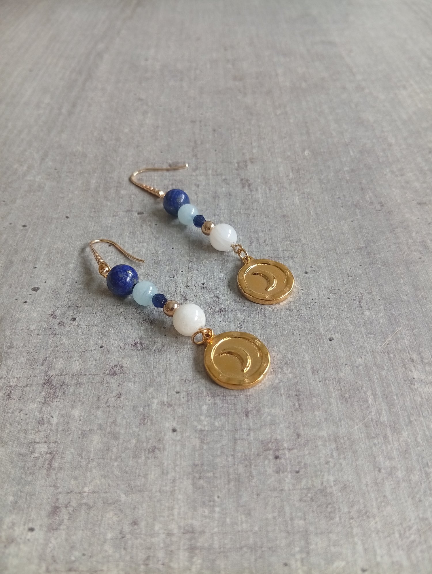 • Pierres : lapis lazuli (8 mm), aigue-marine (6 mm), pierre de lune (8 mm), perle Swarovski bleu marine