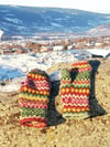 These mittens are inspired by colours and patterns in an “åkle” (blanket) that I once saw in Holbøstua at Maihaugen museum. You can use similar colours, or maybe a blanket or bedspread close to you can inspire you?