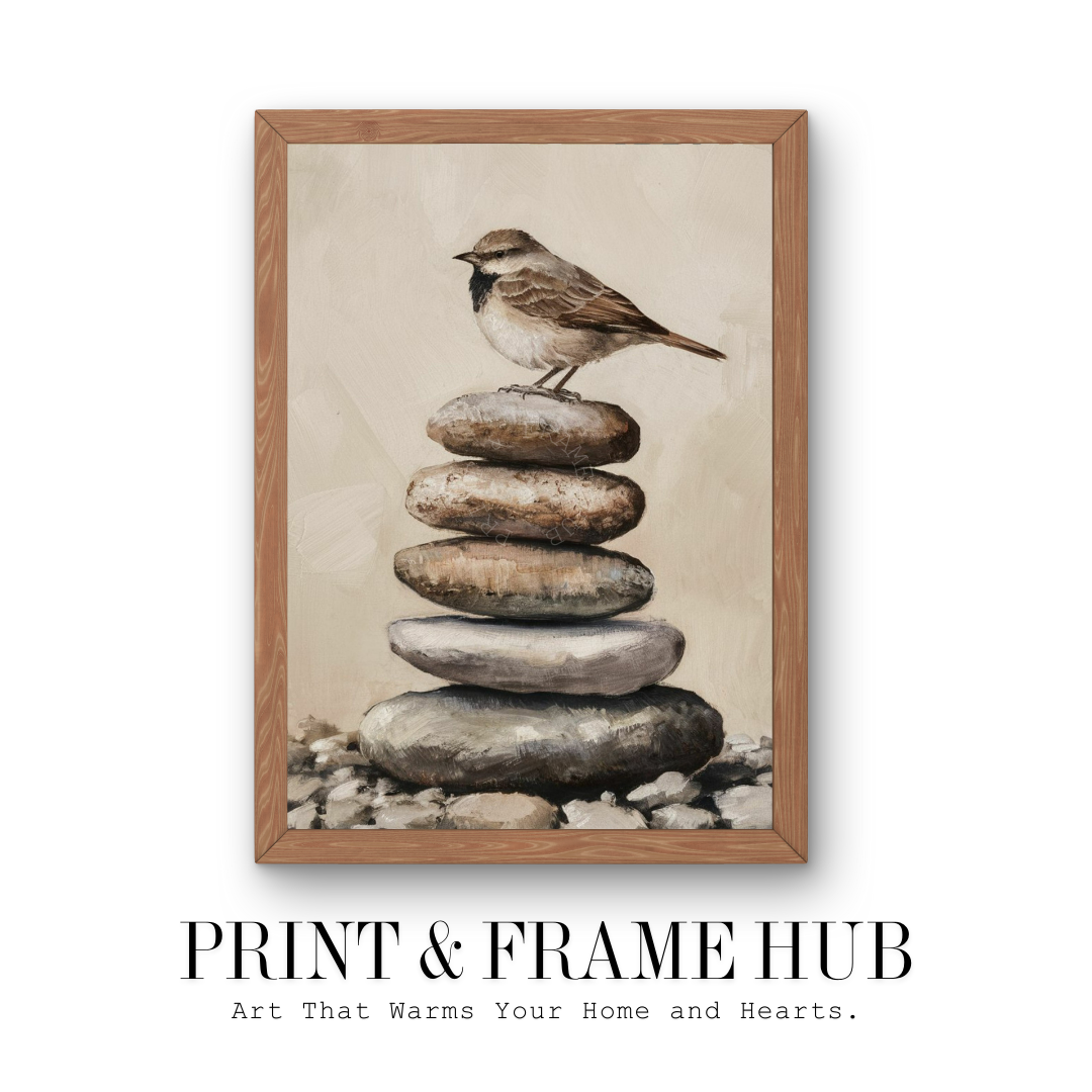This serene painting features a bird perched on a stack of smooth stones in earthy, neutral tones. The natural elements and soft colors make it ideal wall art for any home, adding tranquility and elegance to your living space. Perfect for the living room, bedroom, or hallway, this artwork is a cherished addition to your decor.