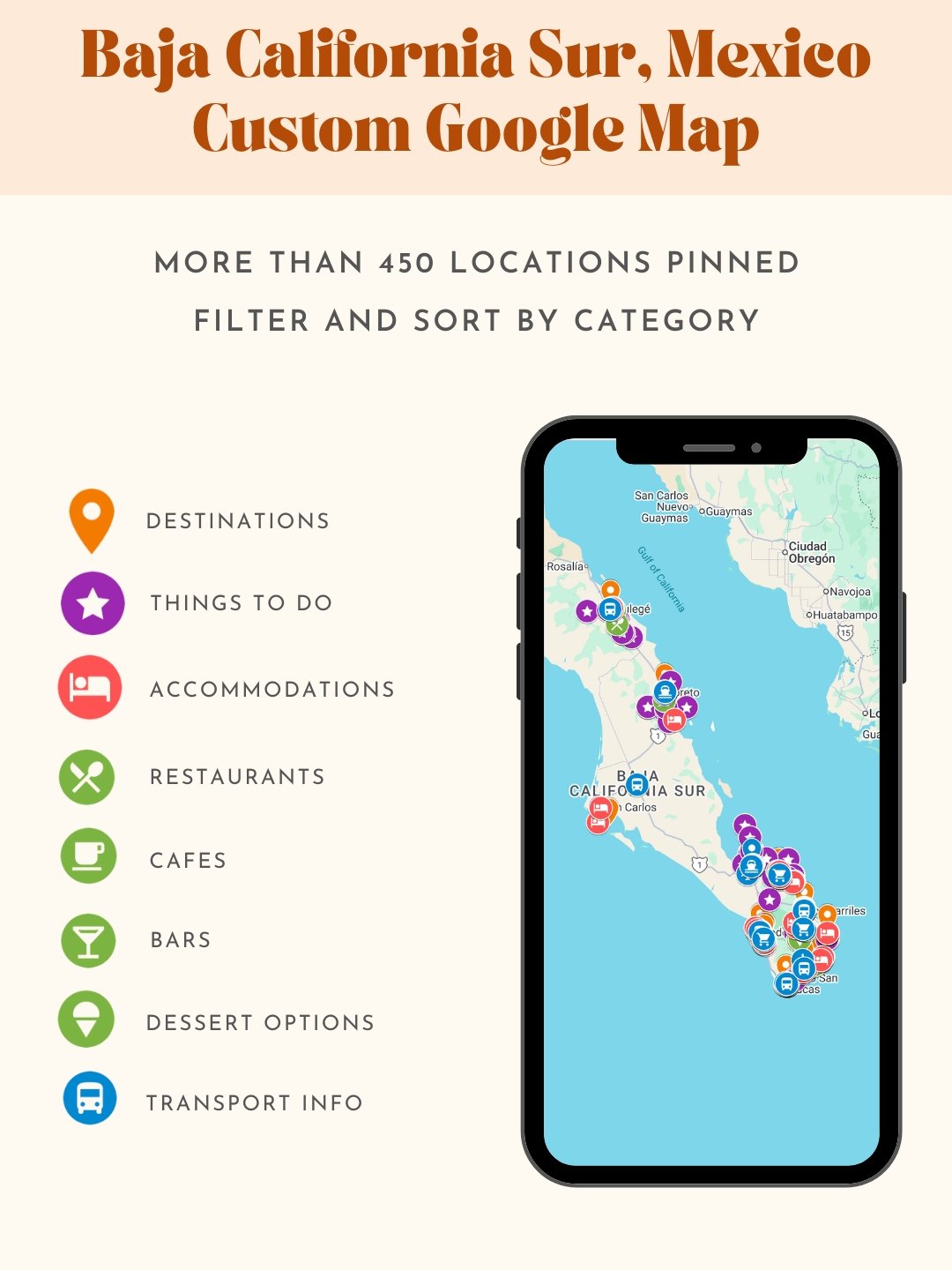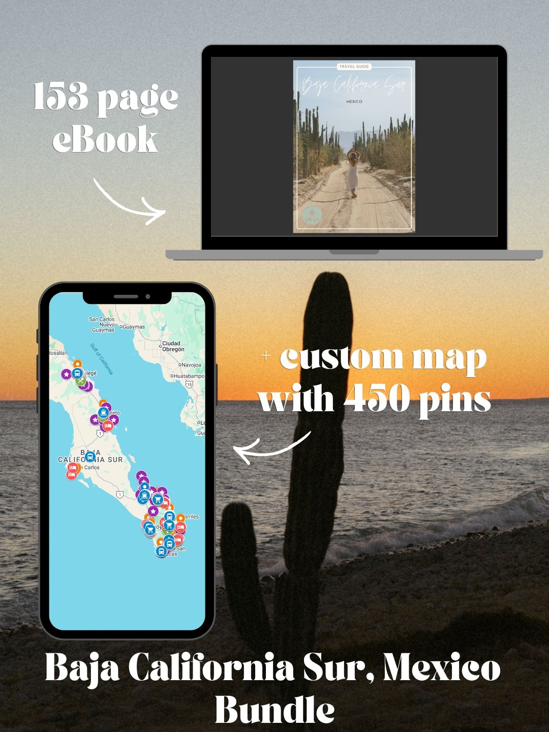 Plan the perfect adventure to Baja California Sur with our bundle, including our 153-page travel guide eBook plus our custom map with over 450 pins.