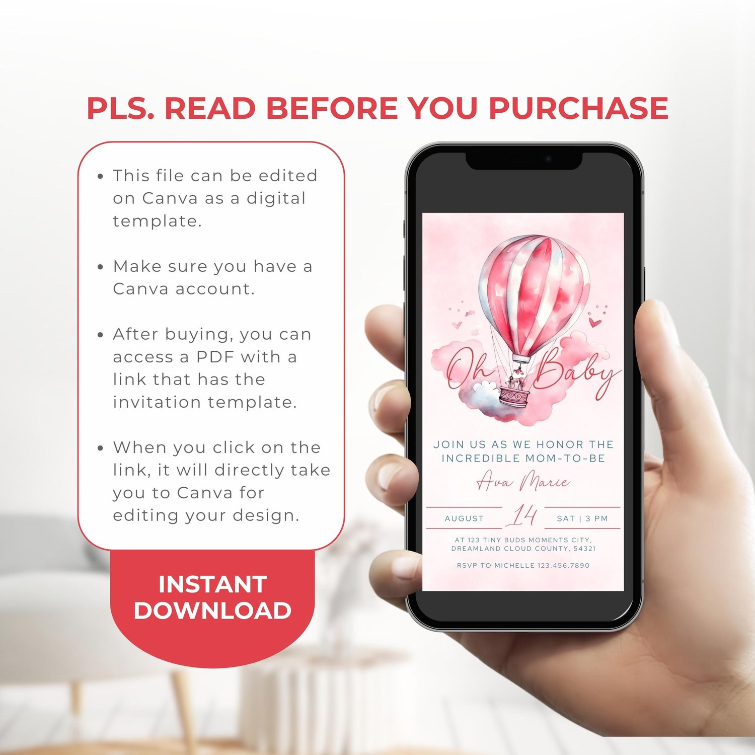 • AFTER PURCHASE, download the PDF. Click "EDIT YOUR TEMPLATE HERE", your CANVA template will open. EDIT then DOWNLOAD as JPG or PNG.
