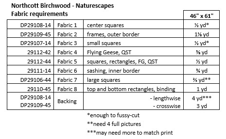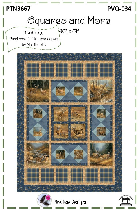 Showcase a panel print or a large-scale print. Northcott's ๐๐ถ๐ฟ๐ฐ๐ต๐๐ผ๐ผ๐ฑ - ๐ก๐ฎ๐๐๐ฟ๐ฒ๐๐ฐ๐ฎ๐ฝ๐ฒ๐ is featured in the quilt on the front. Fussy cut to put โpicturesโ in any of the square or rectangle blocks, The four large squares in the corners on the front are using a panel with six squares, The other squares are fussy-cutting prints. The quilt on the back cover was made by Ruth, one of my testers and features another Northcott collection, Stallion. The other quilts were sewn by testers Dotty and Cheryl. The blue quilt with the loons I made several years ago, then I changed the pattern a bit for this fabric (I've learned a lot about pattern writing since then!).
