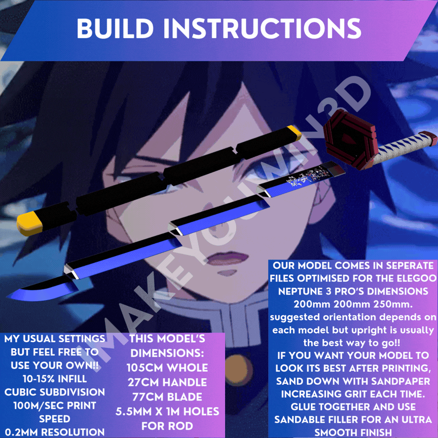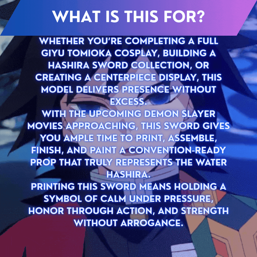 Embody the calm resolve of the Water Hashira with this detailed 3D model inspired by Giyu Tomioka’s Nichirin Sword from Demon Slayer. Simple in appearance yet deadly in practice, Giyu’s blade reflects his quiet strength, discipline, and mastery of Water Breathing.