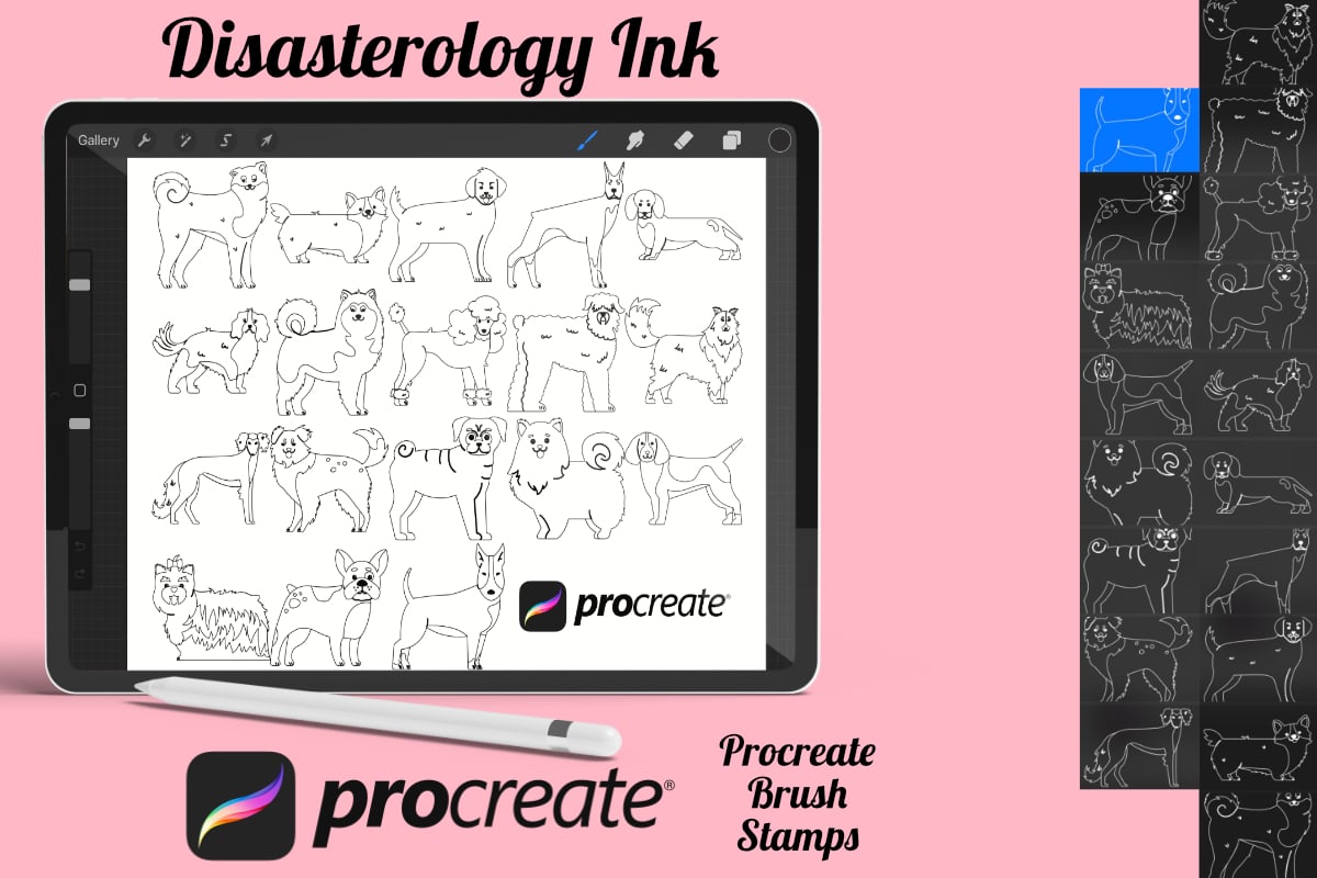 Pack of 18 Cartoon Dog Line Art Procreate Stamp Brushes! These Dog stamps are perfect for making illustration projects or any procreate purpose. You can use these in any colour or opacity and they can be resized to best fit your art. You need Procreate 5.0.8 or 5X, an iPad, and an Apple Pencil. Also, these stamp brushes are not pressure sensitive and can be used with third party stylus, Apple Pencil or even your finger. You can change the colour, size and opacity of these stamps.