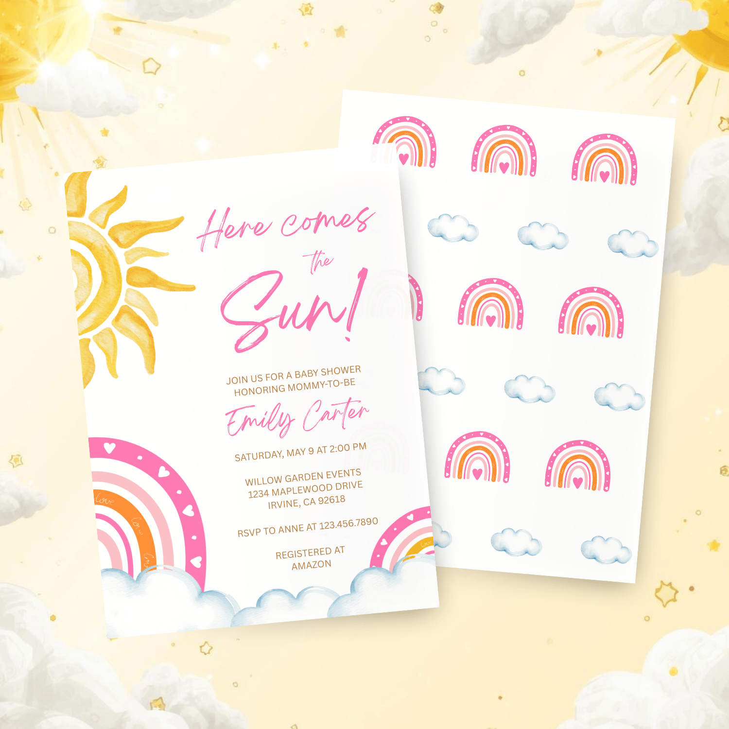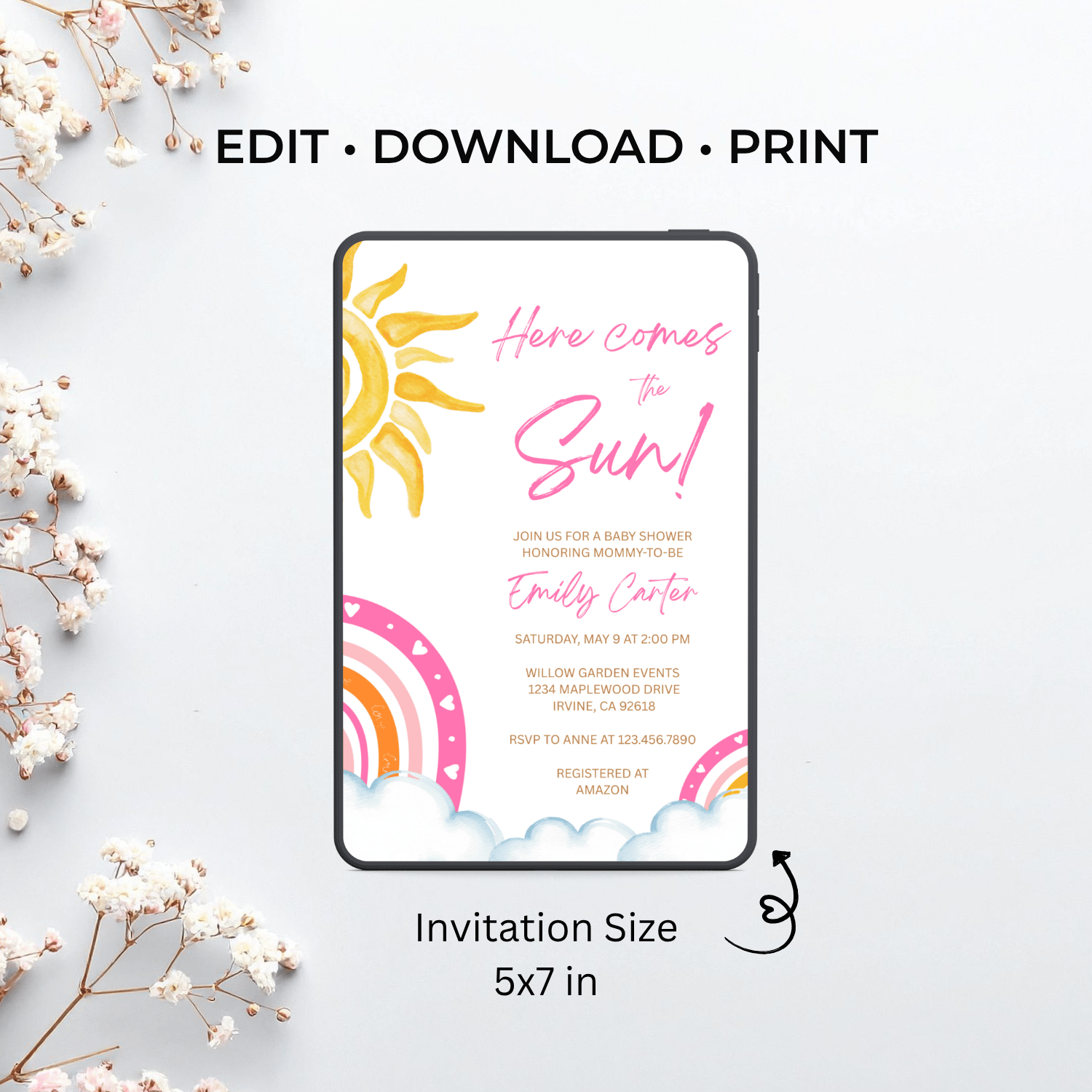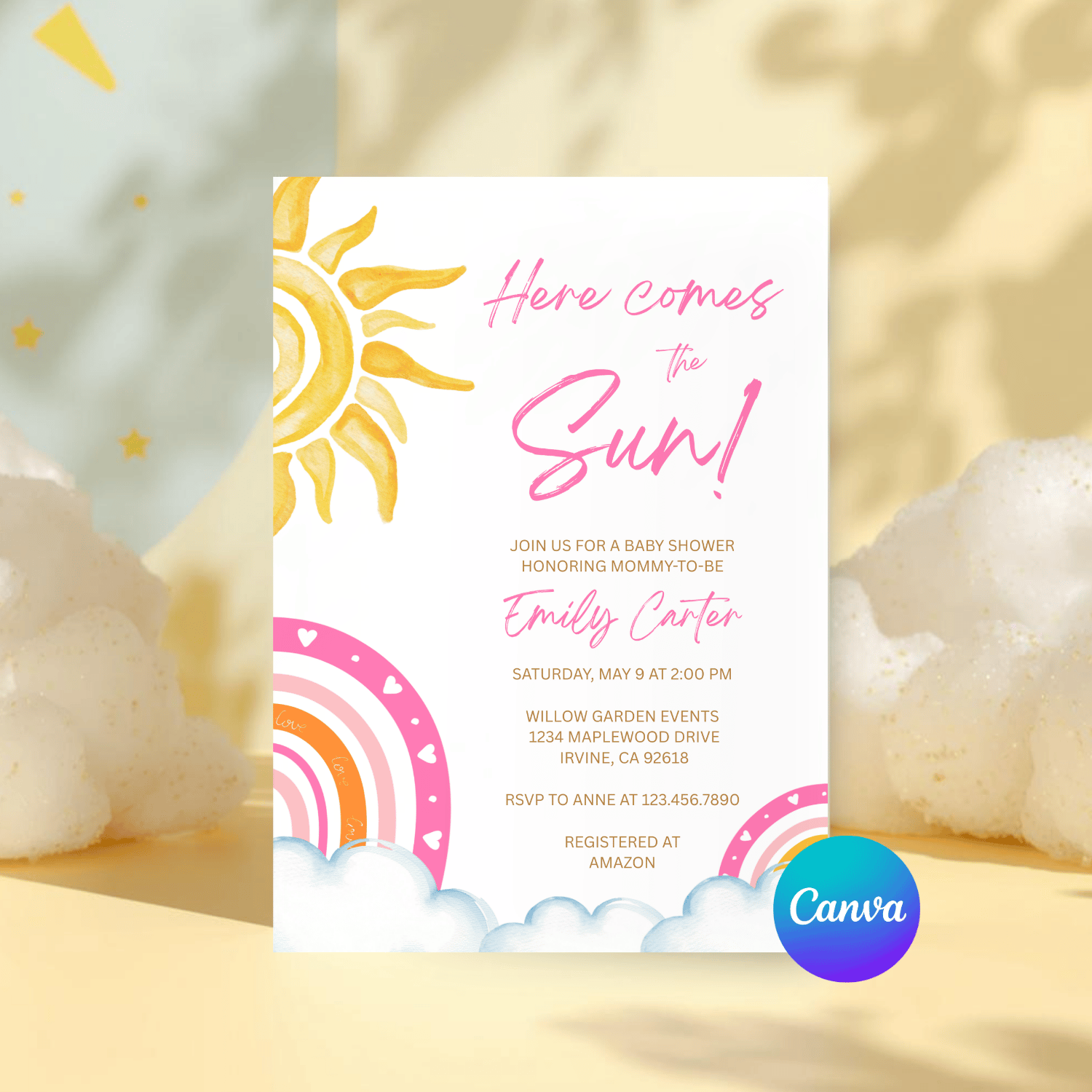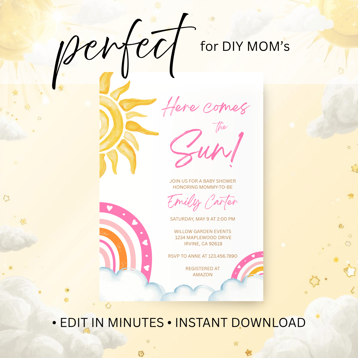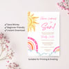 BBY013 Here Comes the Sun Baby Shower Invitation Template | Boho Rainbow Baby Girl Invite | Editable Text in Canva | Instant Download