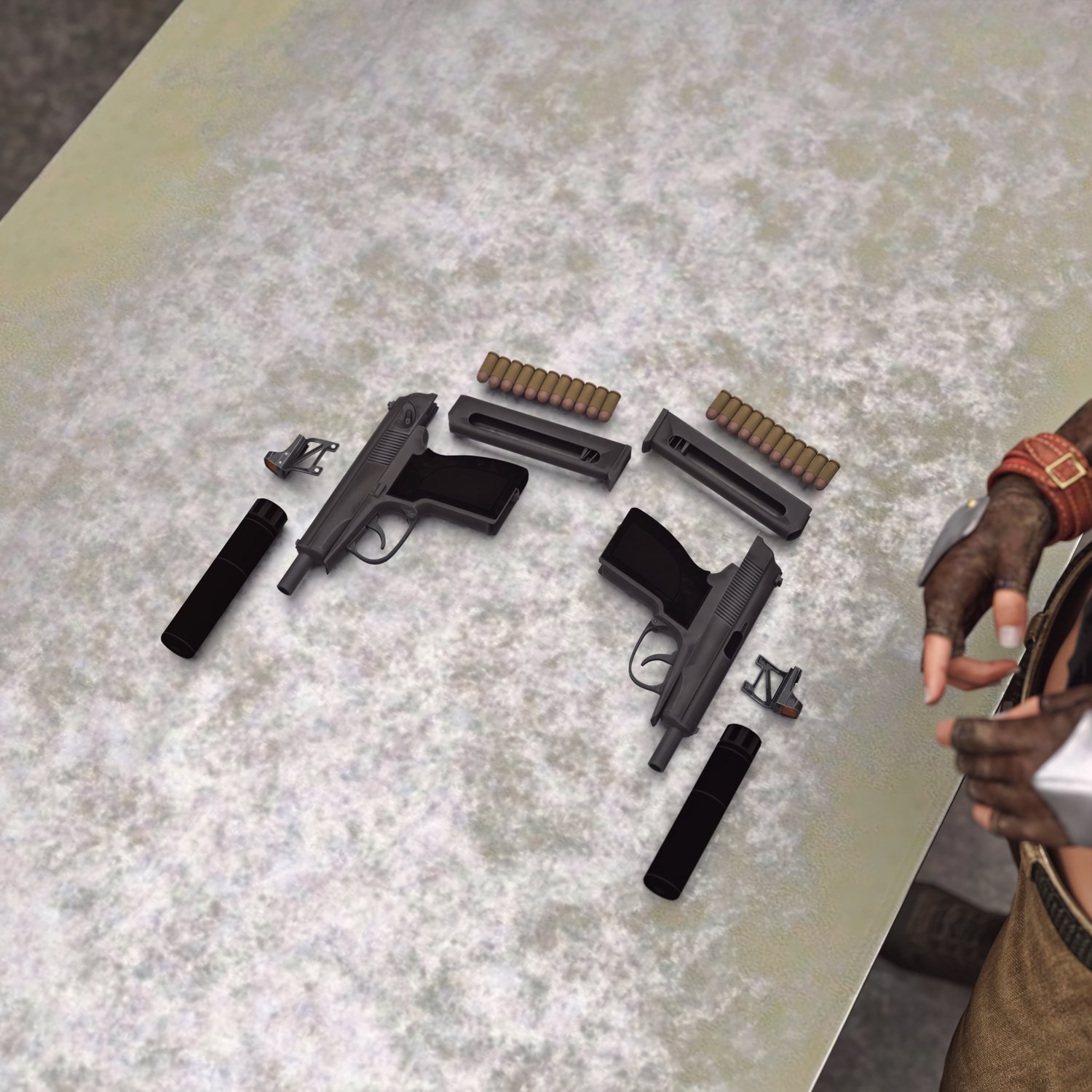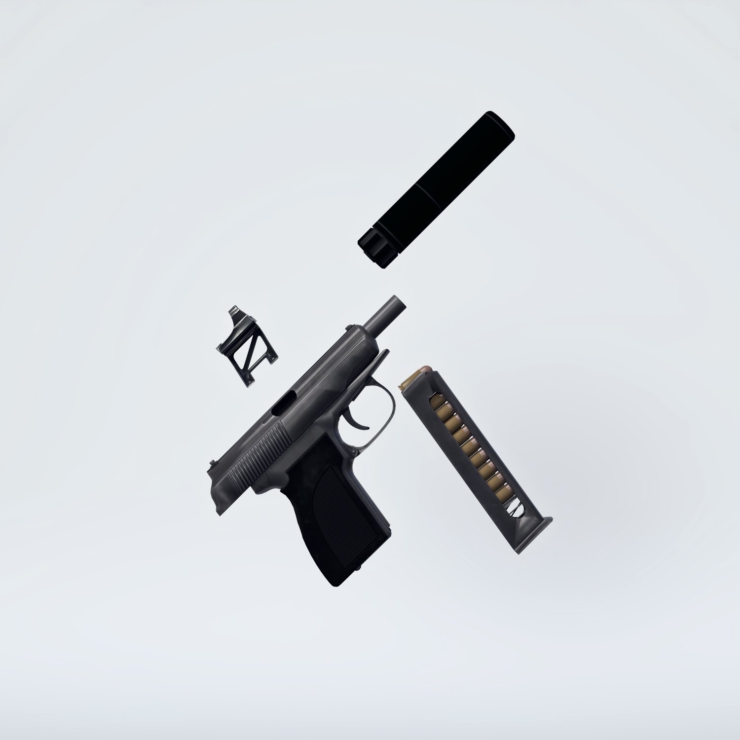 Classic Russian pistol with a bit of modern touch. The red dot and the bracket are rigged, so you can use it as a normal classic PM also. Cool looking one, for lovers of good old times. Includes a silencer, for covert missions and a red dot sight. The prop is rigged and converted for use with DAZ. Trigger, safety, etc also rigged for more realistic pictures. If you're making a spy or a soldier, spetsnaz or any other special people- this pistol suits it all.