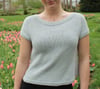 This simple-to-knit summer top has simple lines and a pretty shoulder detail. Knit seamlessly from the top down with yoke-style body increases and raglan-style increases for the reverse-stockinette cap sleeves. No short rows and the only stitches that are picked up are at the underarms.