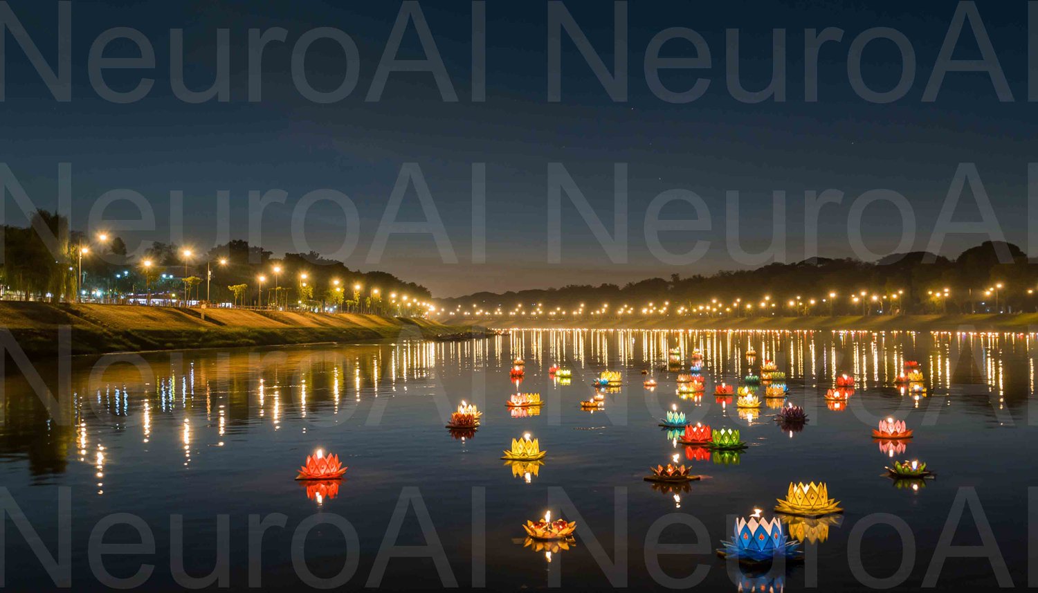 Floating lanterns illuminate serene river at night