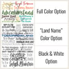 This card kit features 8 different filler card designs in 4x6 cards (3 horizontal orientation and 5 vertical orientation), and each design is subway-style art (think word cloud-type design) focused around a specific "land" within Disneyland.