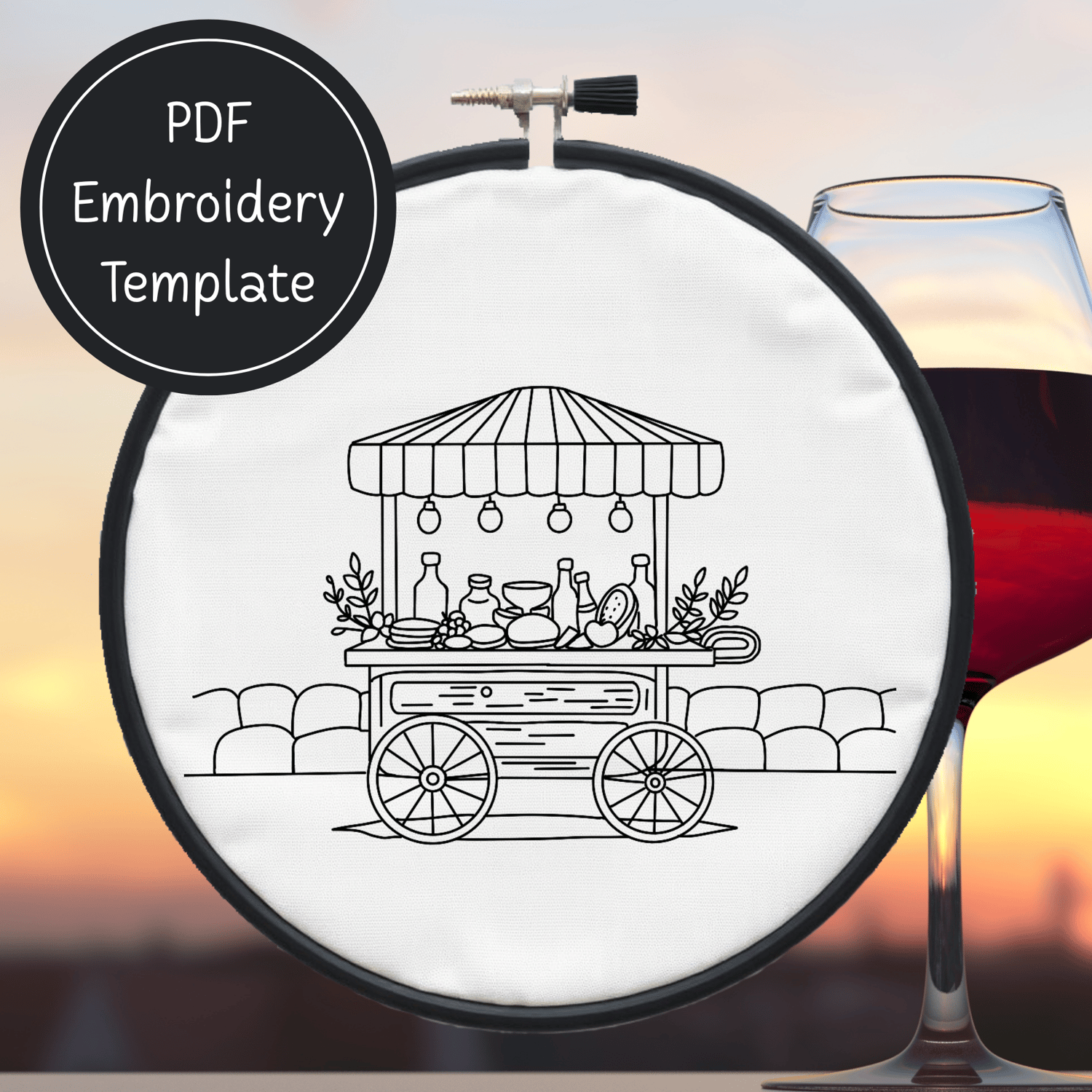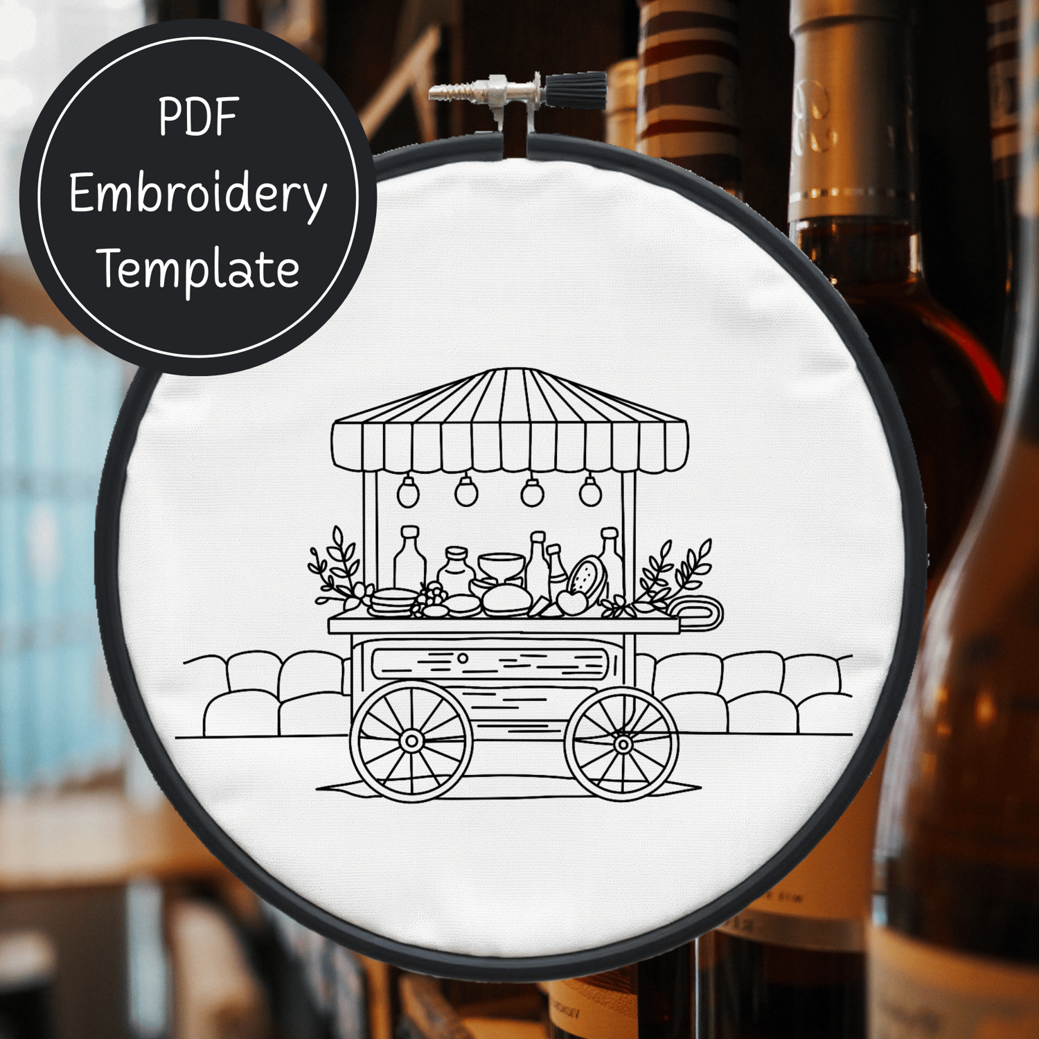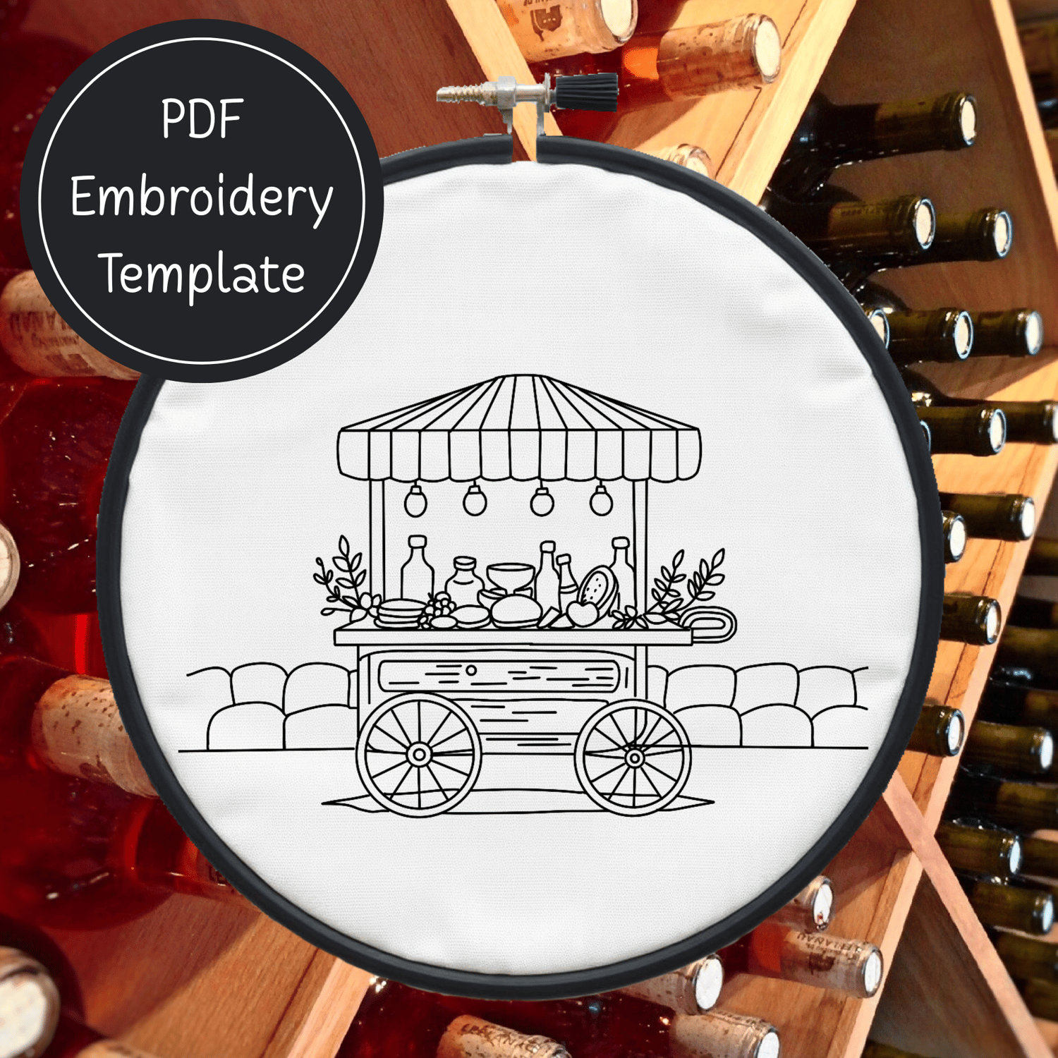 Street Vendor Wine Cart Embroidery Template PDF - DIY Merchant Cart Design For Hand Stitching - Instant Download