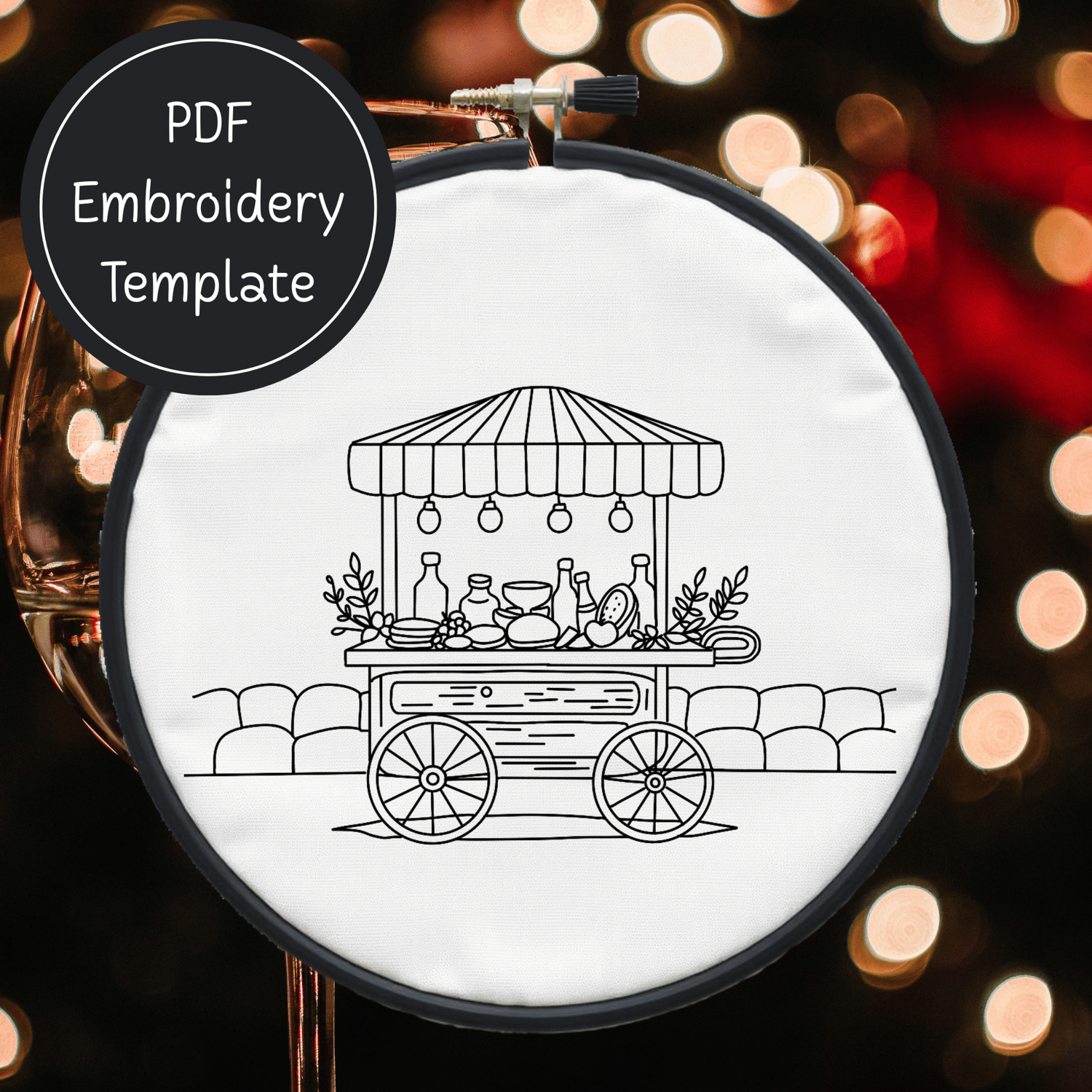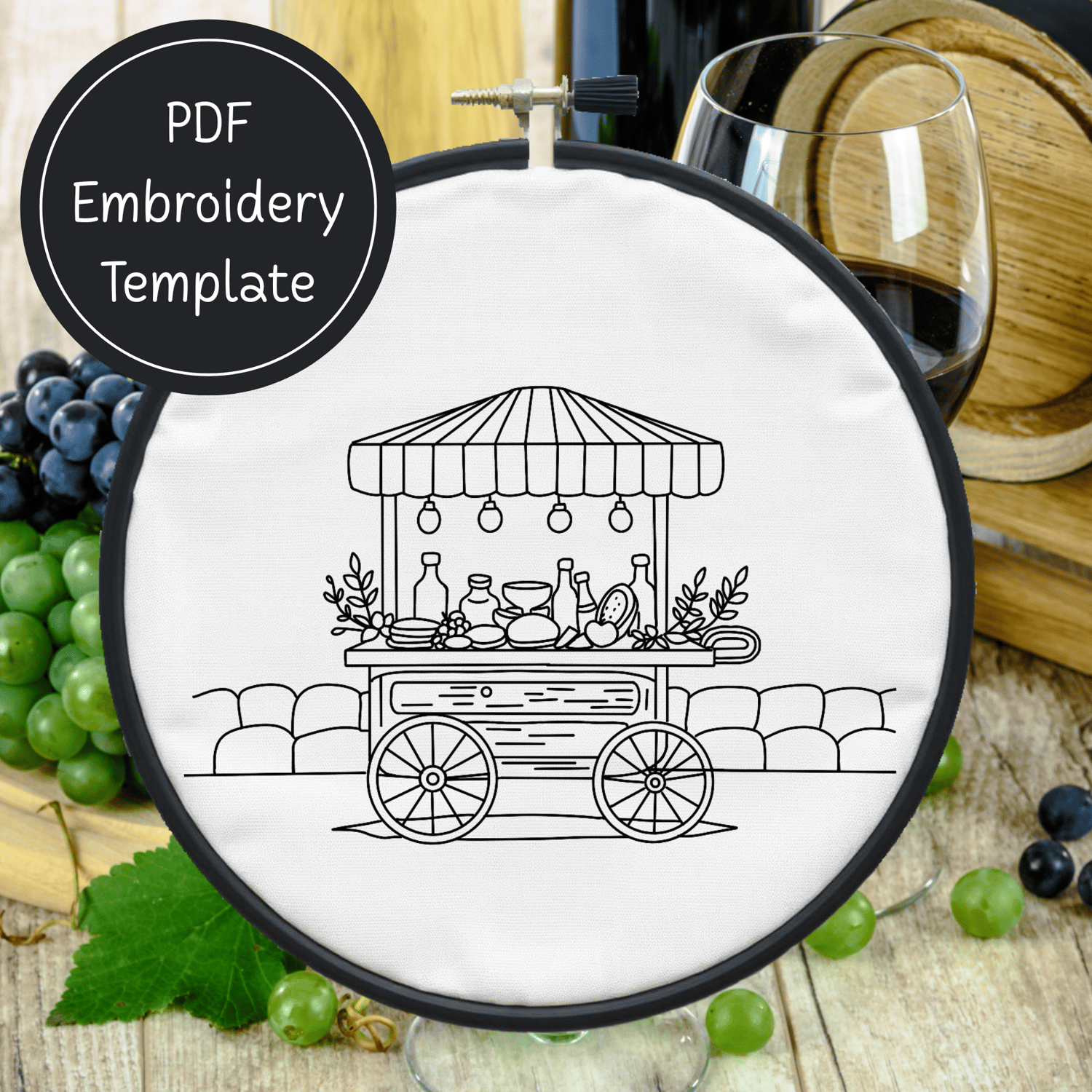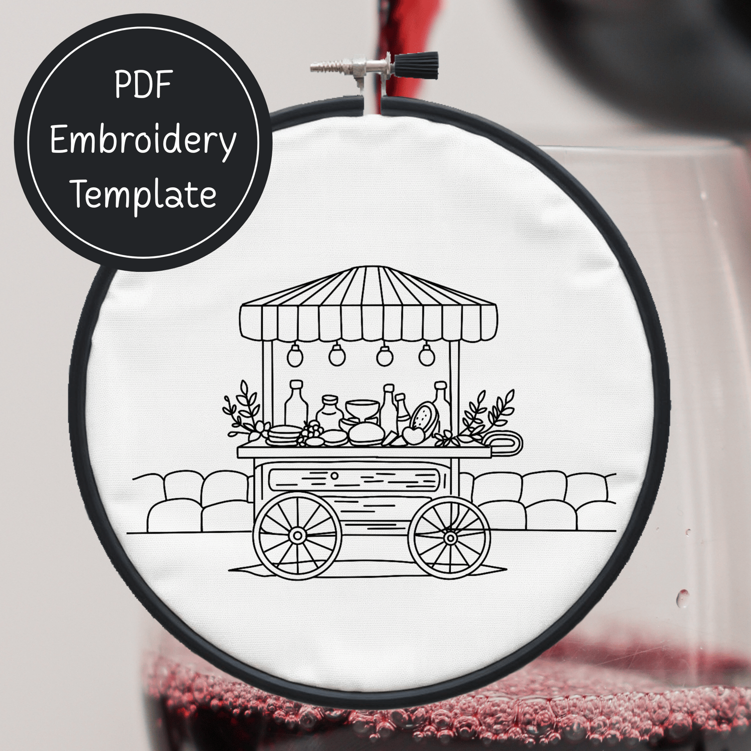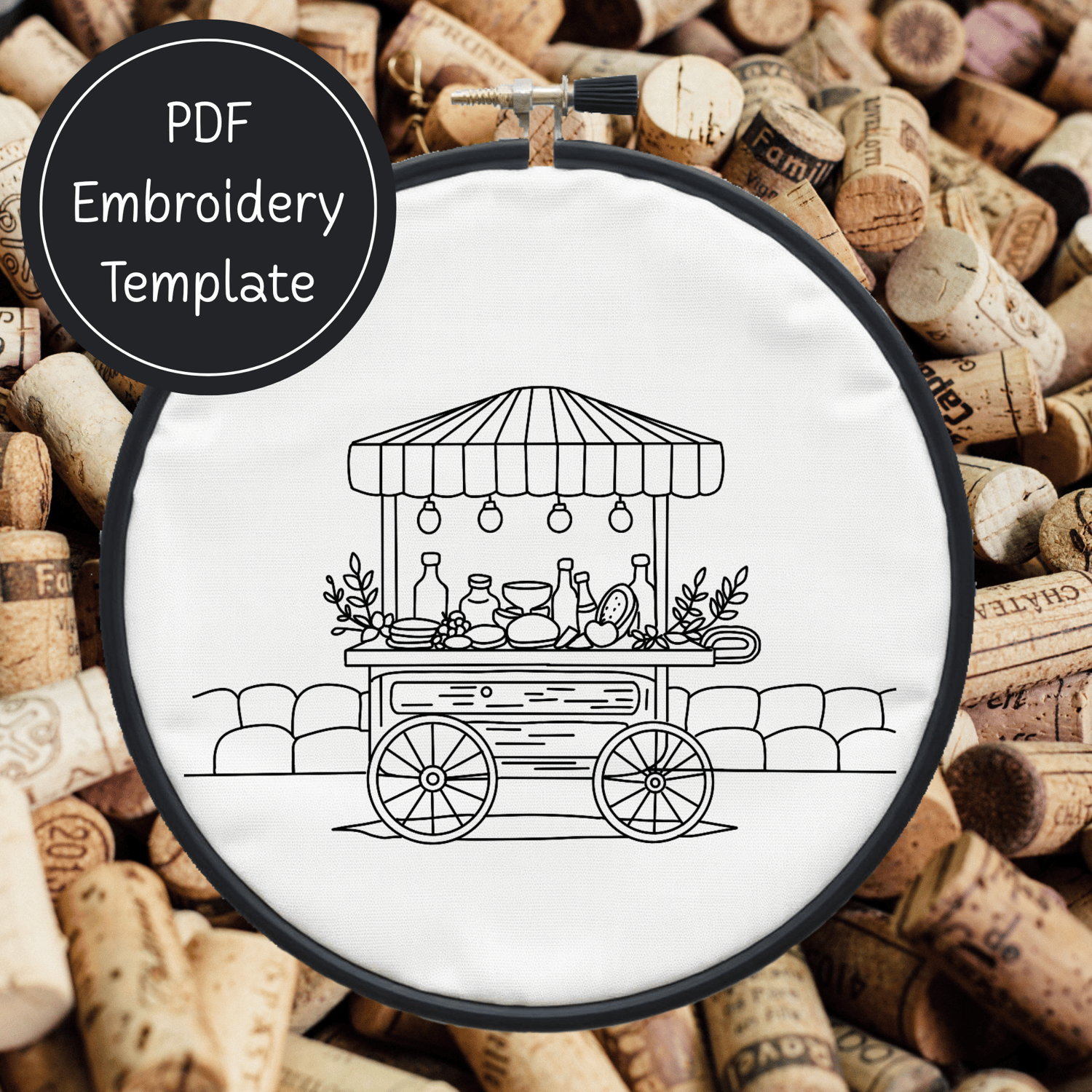 Street Vendor Wine Cart Embroidery Template PDF - DIY Merchant Cart Design For Hand Stitching - Instant Download