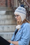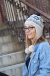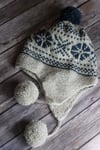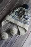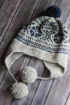his is an off-white and blue colored, Fair Isle designed ear flaps hat, with 3 pompons.