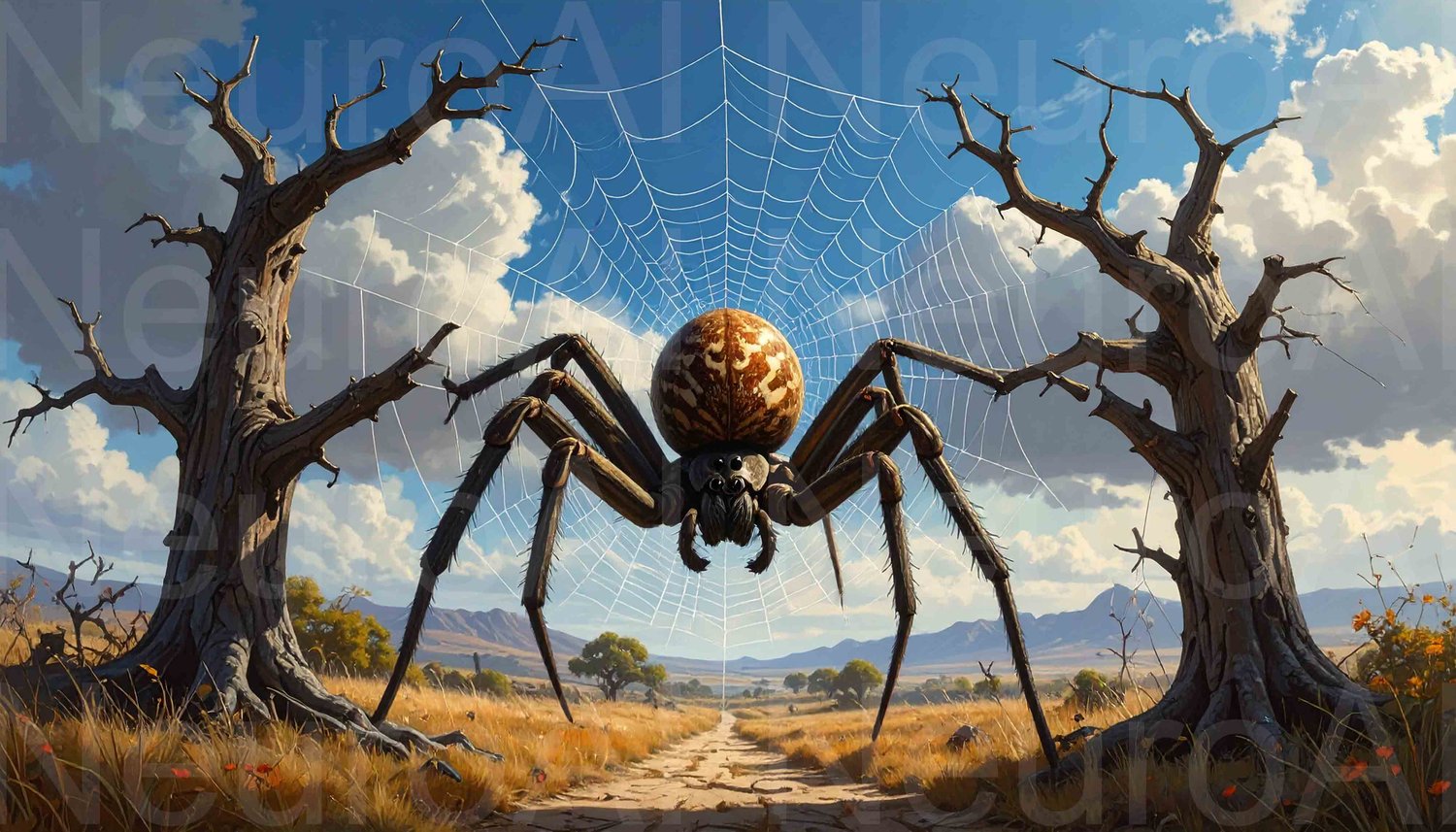 Giant spider on web in arid landscape