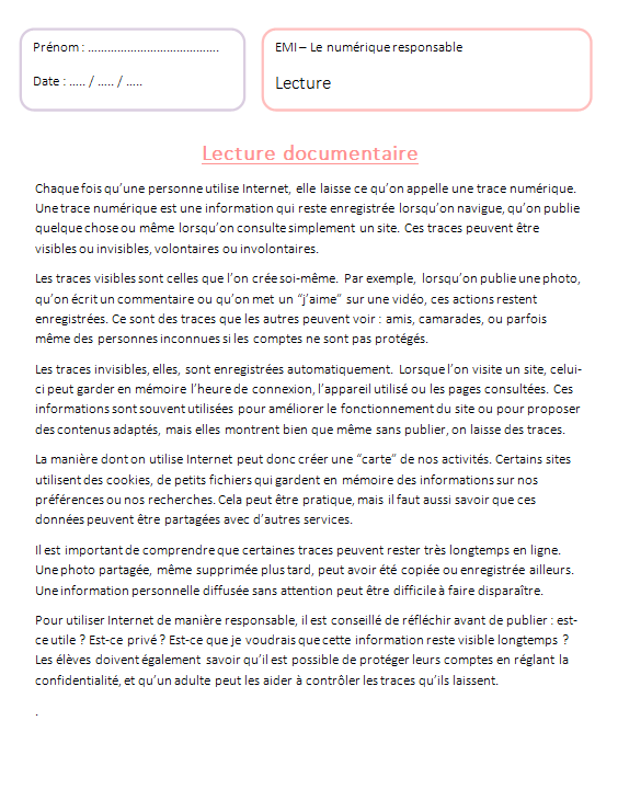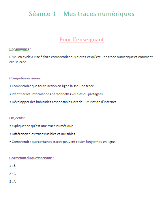 Cette sĂ©quence complĂšte de 5 sĂ©ances EMI pour le Cycle 3 permet dâaccompagner vos Ă©lĂšves vers un usage plus sĂ»r, plus rĂ©flĂ©chi et plus responsable du numĂ©rique.
