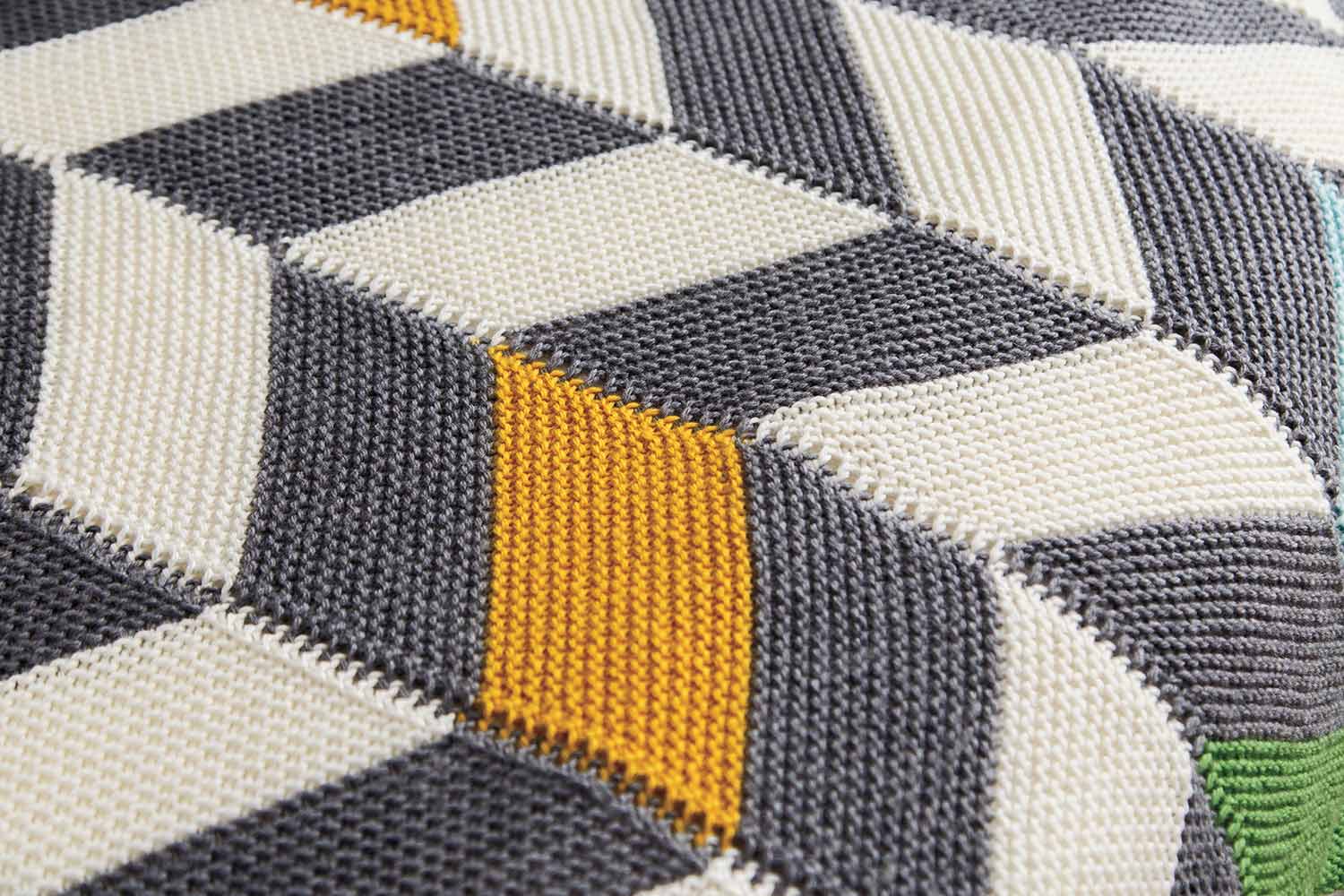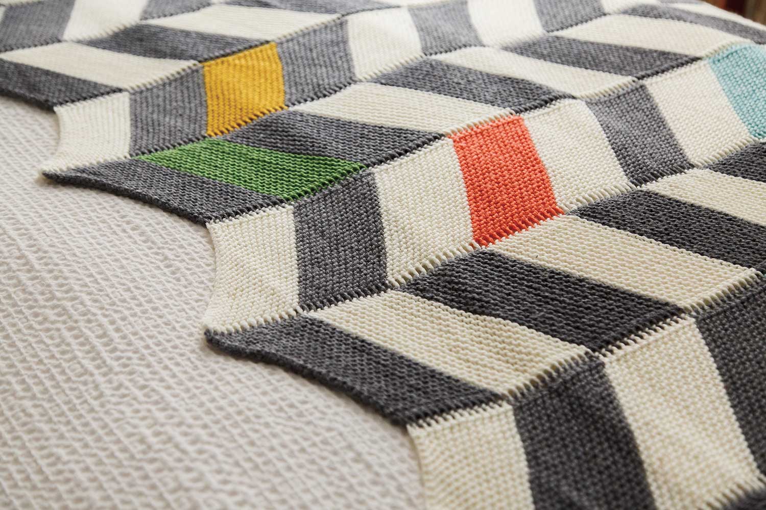 The colour blocks are worked in long Garter Stitch strips, each joined to the one before it as the blanket grows, so there’s no seaming and only one colour in use at a time. Spit splice joins to minimize weaving in of ends. Simple increases and decreases create the chevrons.