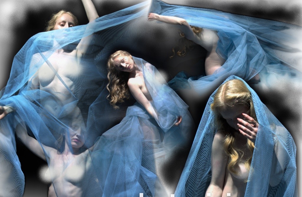 It is a set of 33 photographs that evoke a sensation of the sea with elements of blue veils and poses submerged in a closed environment of corporeal expression inspired by the waves.