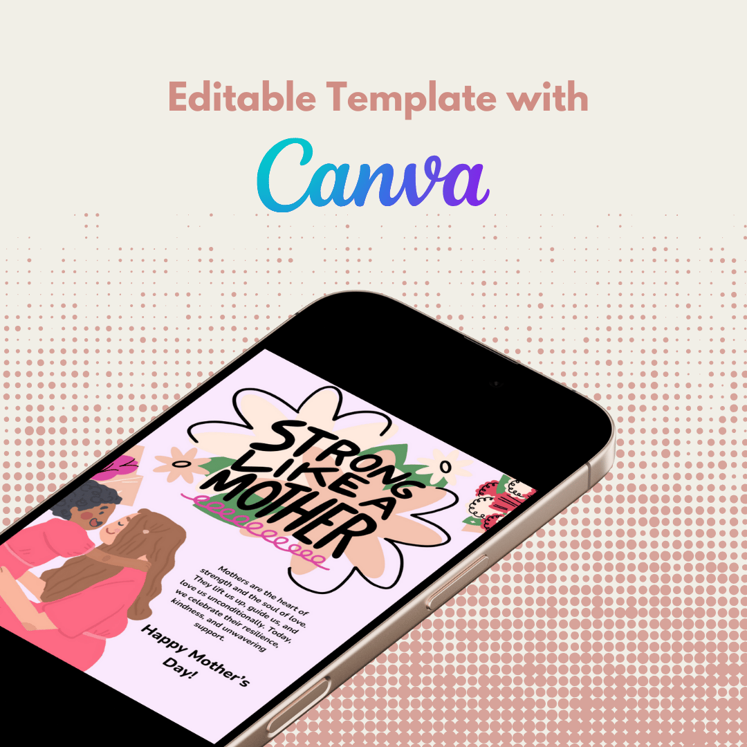 This downloadable and printable Canva template features a delicate yet quirky illustration of a mother and daughter, symbolizing the strength and unconditional love of mothers. Perfect for sons and families looking for a heartfelt and stylish way to express their love, this card blends a classic touch with a modern, fun aesthetic. The strong yet delicate typography enhances the message, making it an ideal gift to honor and appreciate mothers on their special day.