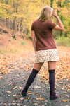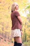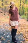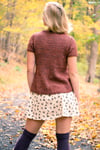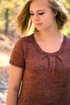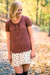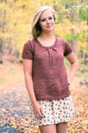 Construction: Box Pleat is cast on at the bottom and worked in the round, beginning with a narrow ribbed hem with a rolled edge, to the armholes. Shaping is worked on the back only along the princess lines, then the front and back are divided at the armhole and worked separately to the shoulders, with the extra ease in the front consumed by the pleating at the neckline. The short, fitted sleeves are picked up and worked with short rows for the sleeve caps, then finished with a narrow rib cuff and a rolled edge that matches the casual flirtiness of the bottom hem. Finally, stitches are picked up around the scoop neckline, and worked in K1P1 rib.