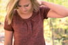 Size: 36.5 (38.5, 40.5, 42.5, 44.25, 46.5, 48.25, 50.5, 54.5, 57.25)” circumference, to fit 30, (32, 34, 36, 38, 40, 42, 44, 48, 52)” bust; this top is designed to be worn with about 6” of ease, created by the front pleats above the bust.