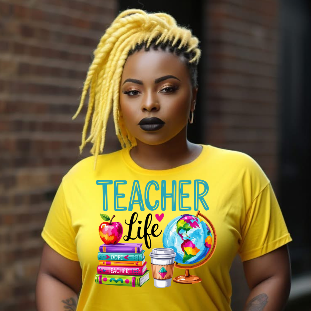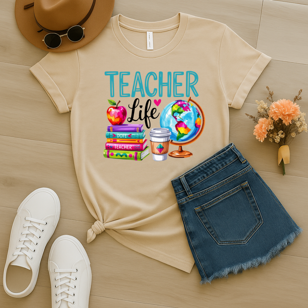 Celebrate the educators who shape the world! This fun and colorful “Teacher Life” design features stacked books, a globe, a coffee cup, and a vibrant red apple—perfect for back-to-school shirts, totes, mugs, and more!