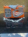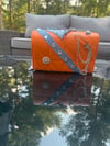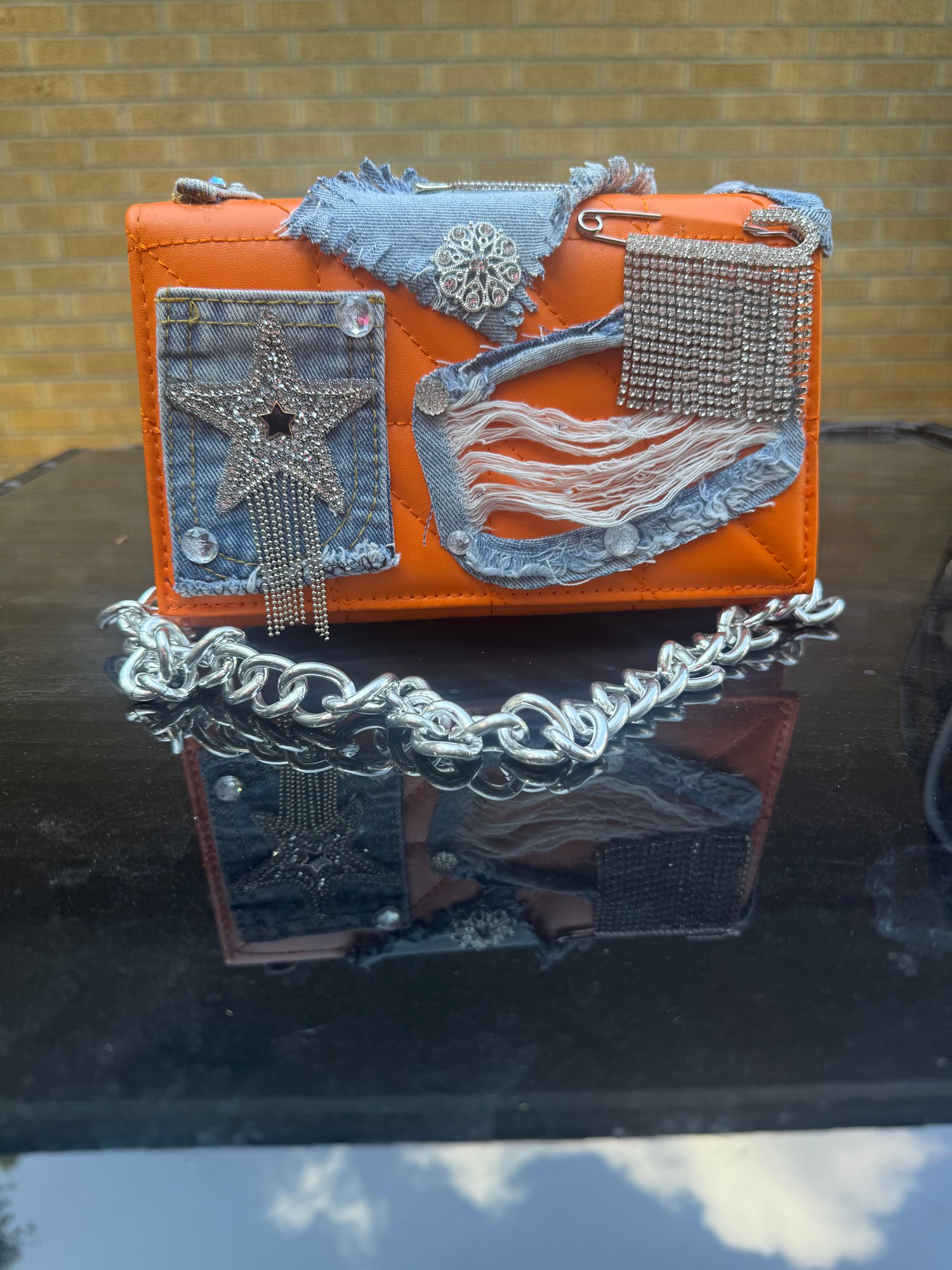 Unleash your wild side with this custom orange quilted junk purse, dripping with unapologetic attitude. Hand-embellished with shredded denim, sequined studs, dangling chains, and punk-inspired star accents, every inch screams defiance and originality. The front strikes hard with a bold diagonal denim strap lined in silver studs and a star charm chained for maximum edge. Flip it, and the back explodes with patchwork chaos—glittering star appliqués, ripped denim fringes, cascading rhinestone fringe, and metal medallions that transform this bag into wearable street art.