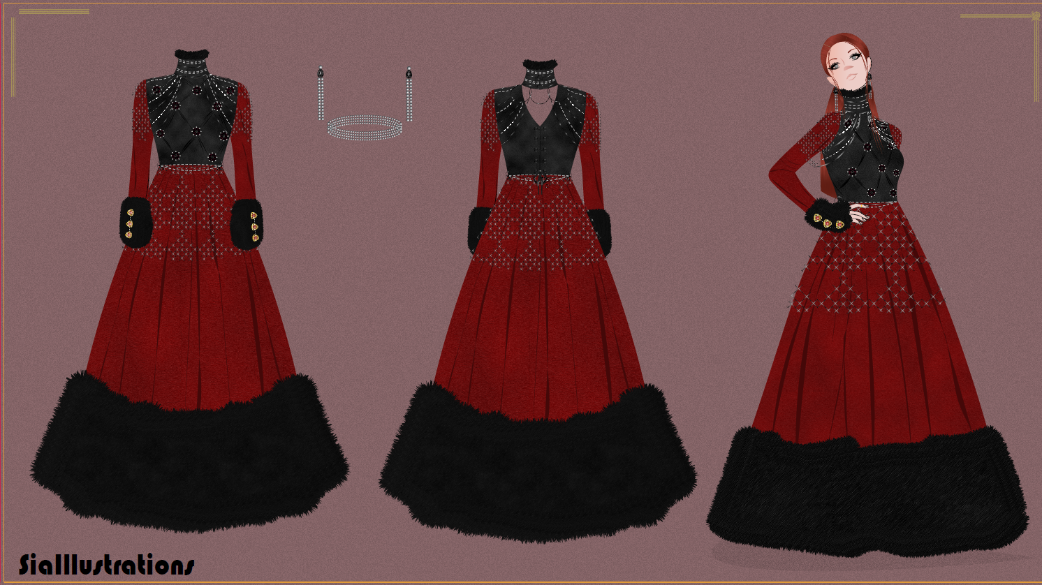 Embrace your chic and mysterious look with "Dark Luxury 2021 Collection Pt. 2". Continuing the "Dark Luxury Collection" for lovers of black color with two new design clothing. The first design is an off-shoulder black dress with yellow roses décor and outer puff sleeves and inner butterfly style sleeves. The second design is a red fur gown with turtle neckline black diamond and chain embroidery top and long fur cuff sleeves. The detailed design, front and back view of each clothing is available in PNG and PDF format.