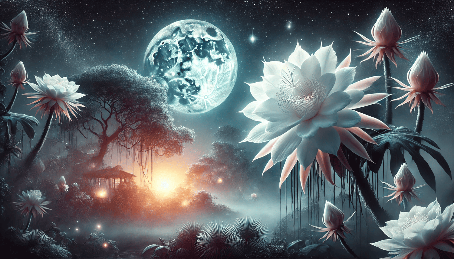 This artwork captures the ethereal and delicate essence of the Kadupul Flower in full bloom, surrounded by a mystical nighttime glow, set in the tranquil landscapes of Sri Lanka.