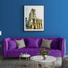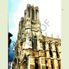 This printable wall art shows a corner view of the imposing bell towers of a Gothic French cathedral.