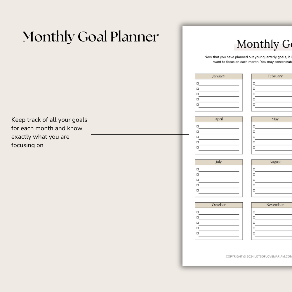 - Quarterly & Monthly Goal Planner – Break down your big goals into manageable steps to stay on track.