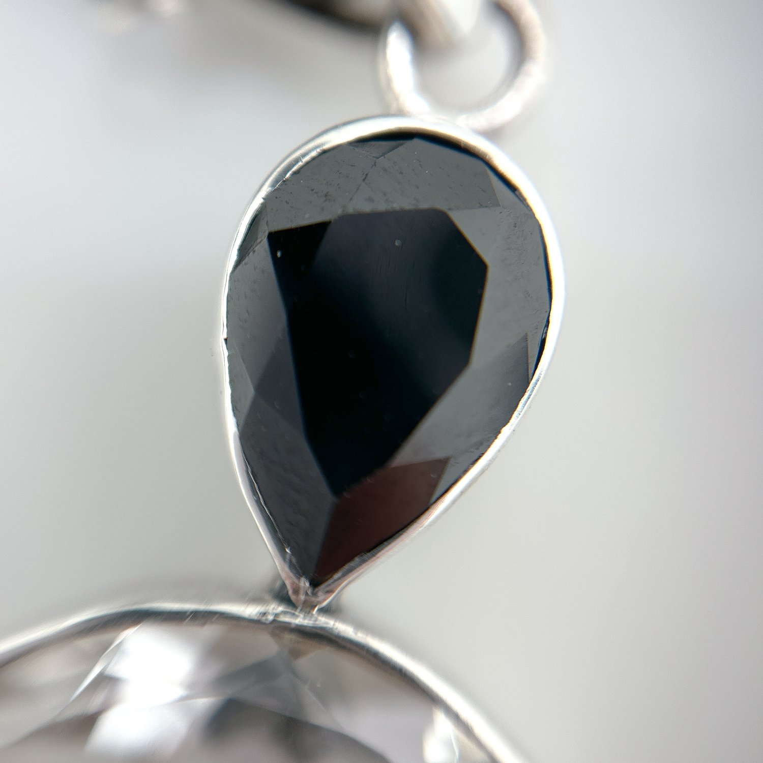 Crafted from a trio of stones chosen for their depth and clarity, this piece centers around a striking shield of black-and-white banded onyx — a symbol of both protection and balance. A deep black onyx teardrop anchors the heart, while a brilliant marquise-cut Herkimer diamond lifts the gaze skyward. Together, they create a dynamic energy field: grounded, yet luminous. Fierce, yet clear.